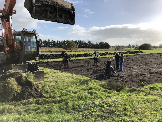 Efter at have søgt og fået bevilget midler til en egentlig arkæologisk undersøgelse af fundstedet hos Slots- og Kulturstyrelsen, har vi onsdag d. 23. oktober 2018 været ude at eftergrave på findestedet, naturligvis med deltagelse af finderen og flere andre detektorfolk.