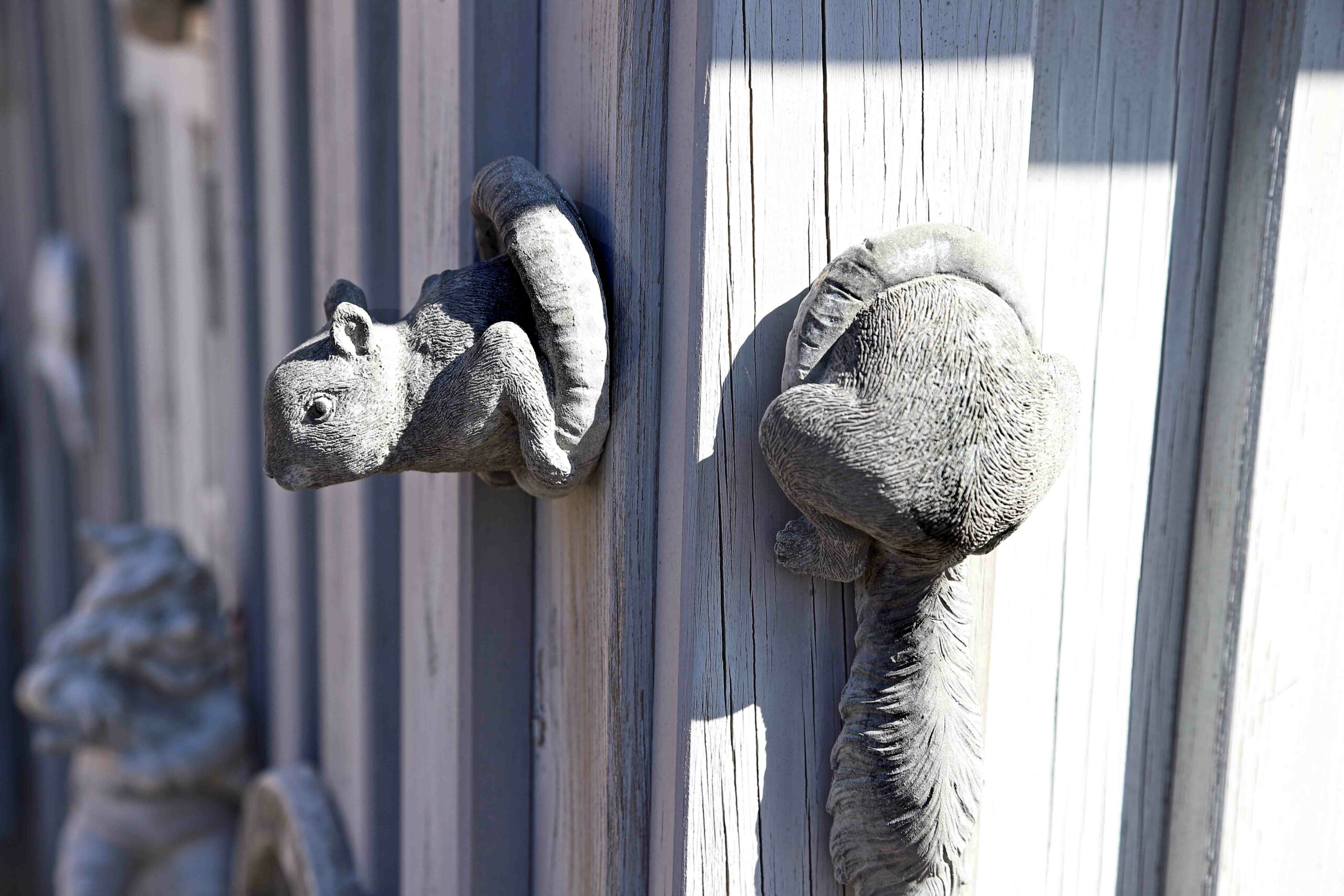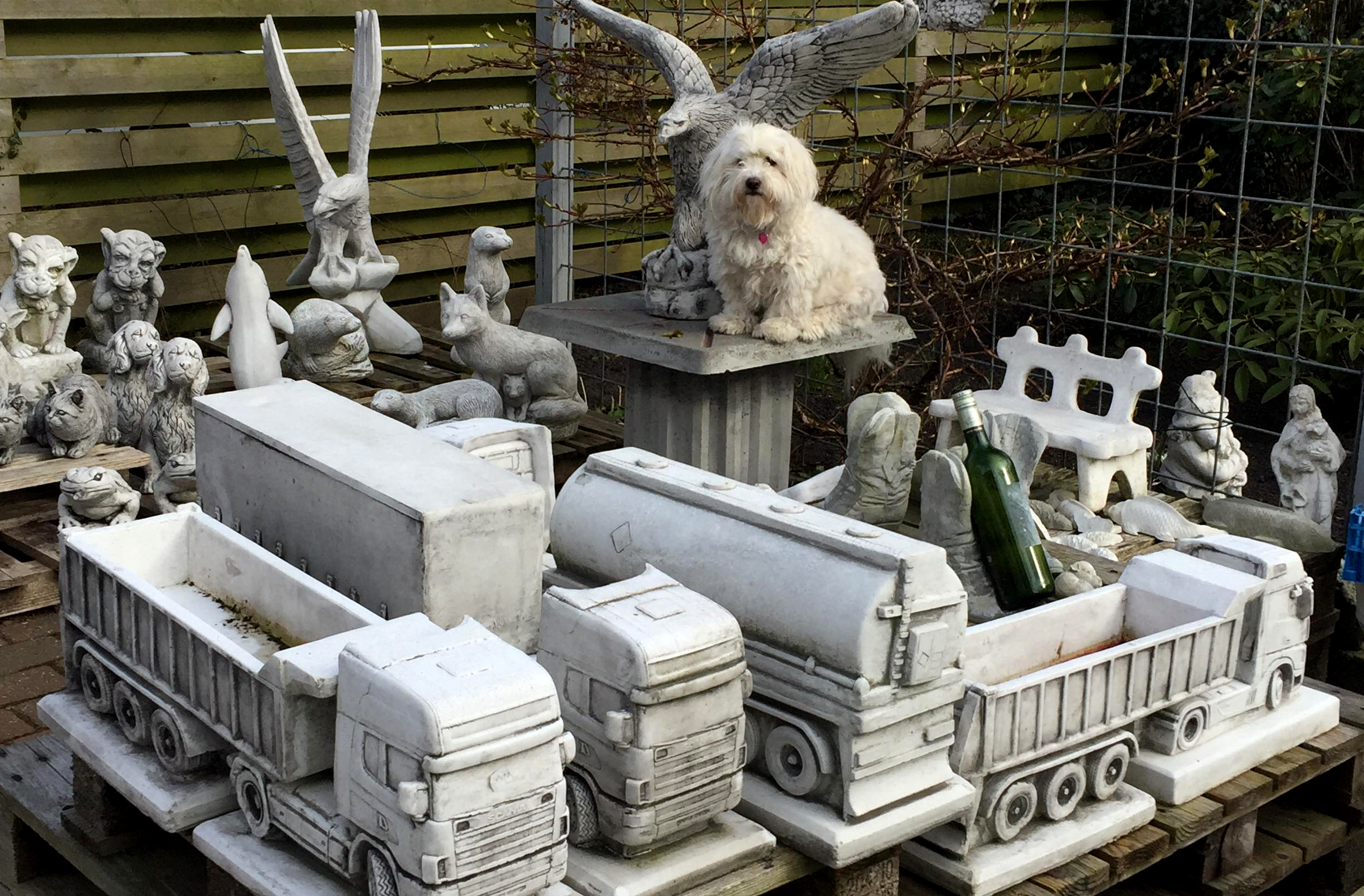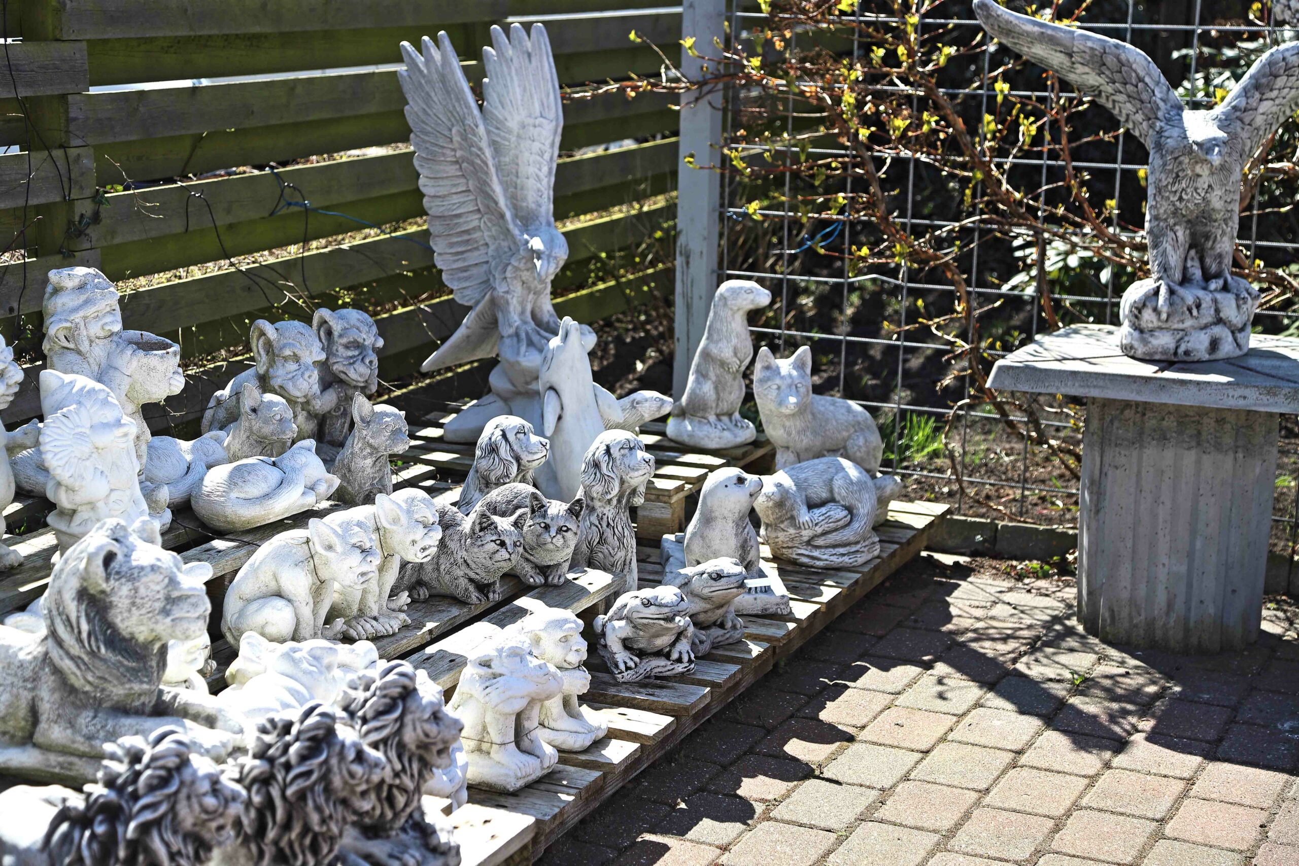 Et besøg i haven afslører et stort lager af figurer. Mon du kan finde bomuldshunden Ziva, som ville være med på et gruppebillede? Når man har så mange – mere eller mindre tunge figurer – så skal der naturligvis også være udstyr hertil. – Ja, men jeg klarer mig nu med en sækkevogn, en palleløfter og en mørtelblander.