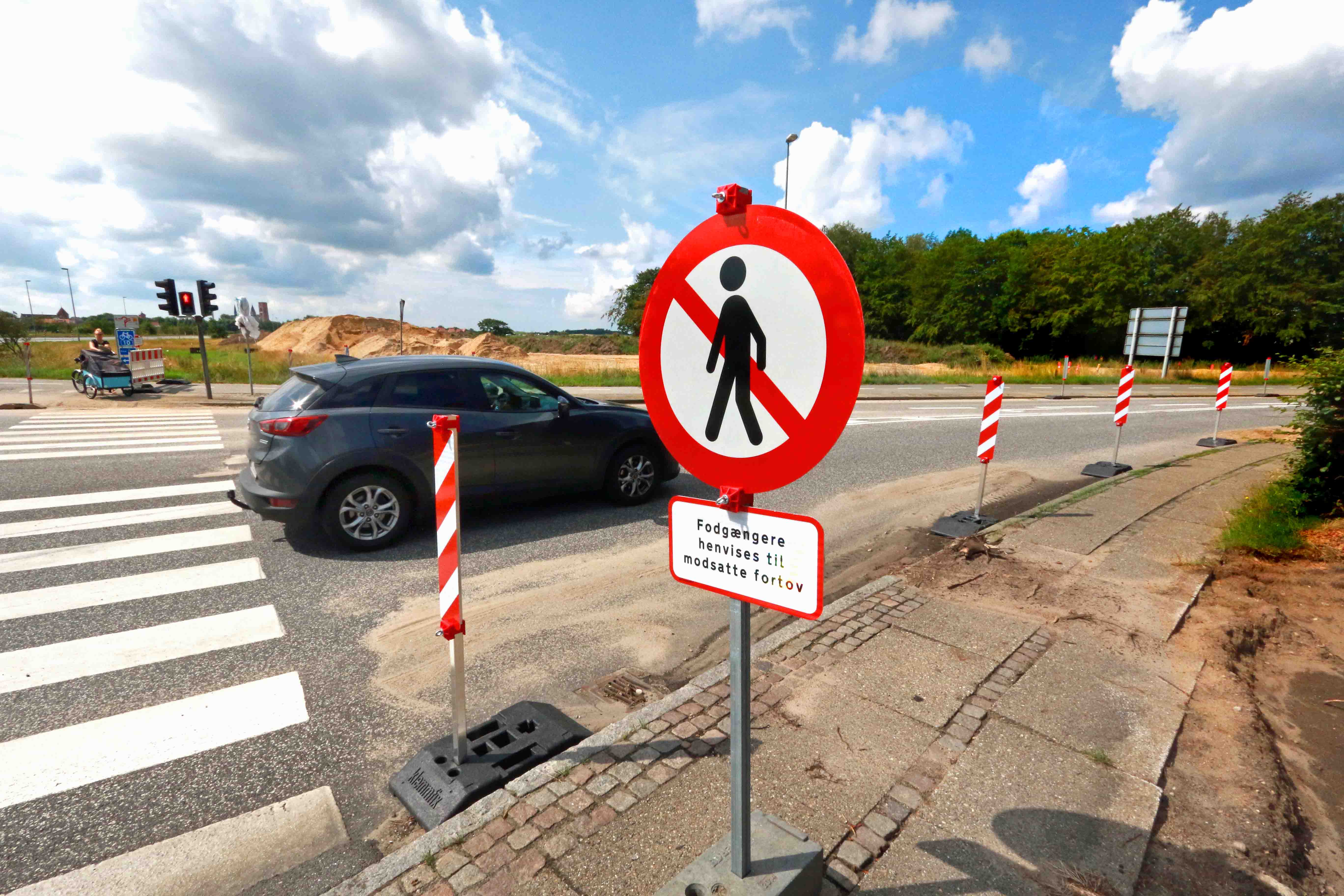 Fodgængerne skal over på det modsatte fortov, idet forbindelsen henover Plantagevej lukkes! Alle afstribninger er raspet væk – og trafikken ligger kun på østsiden. Det er hensigten, at cyklister mod Farup skal køre på vejbanen på den modsatte side.