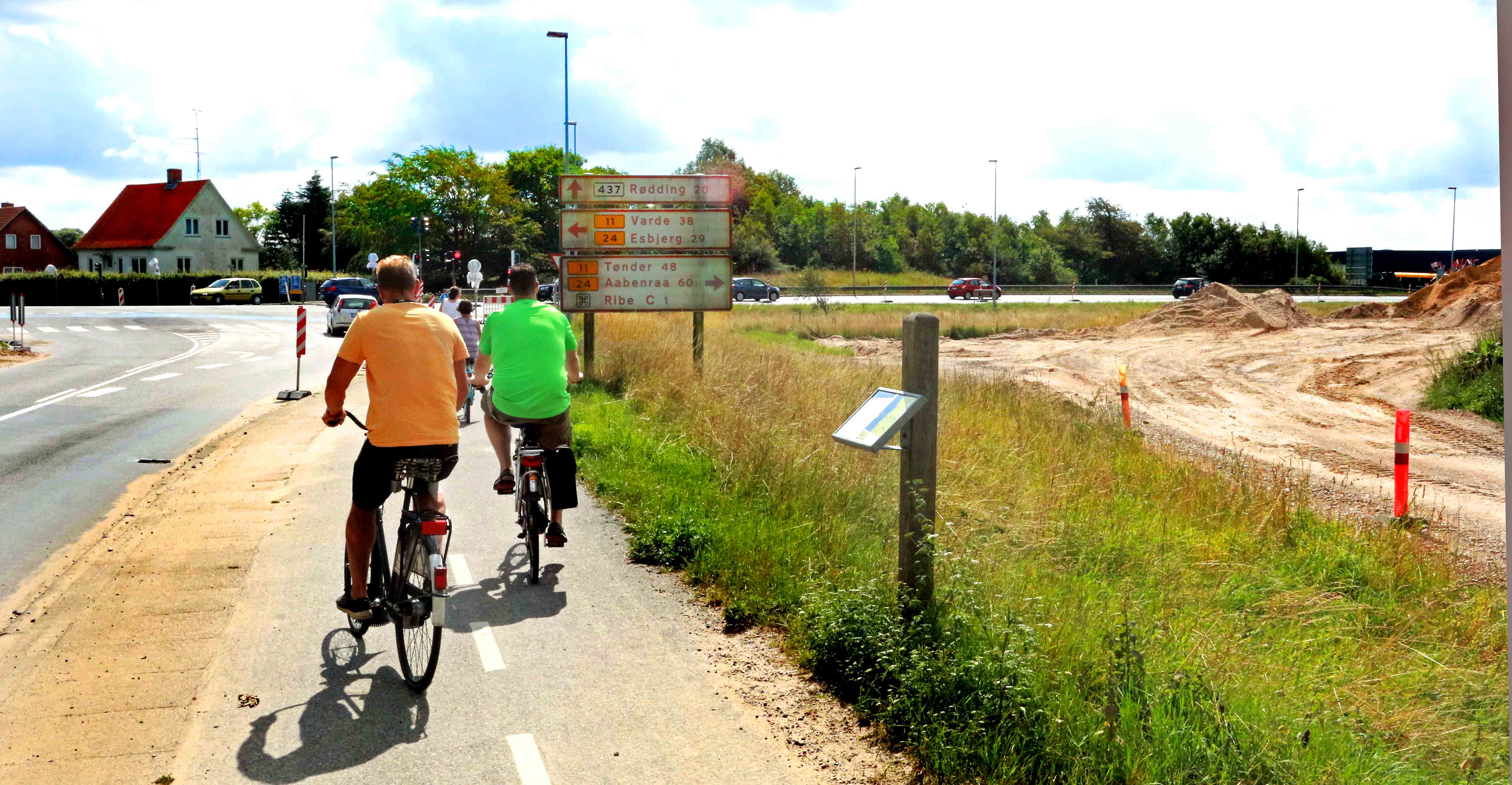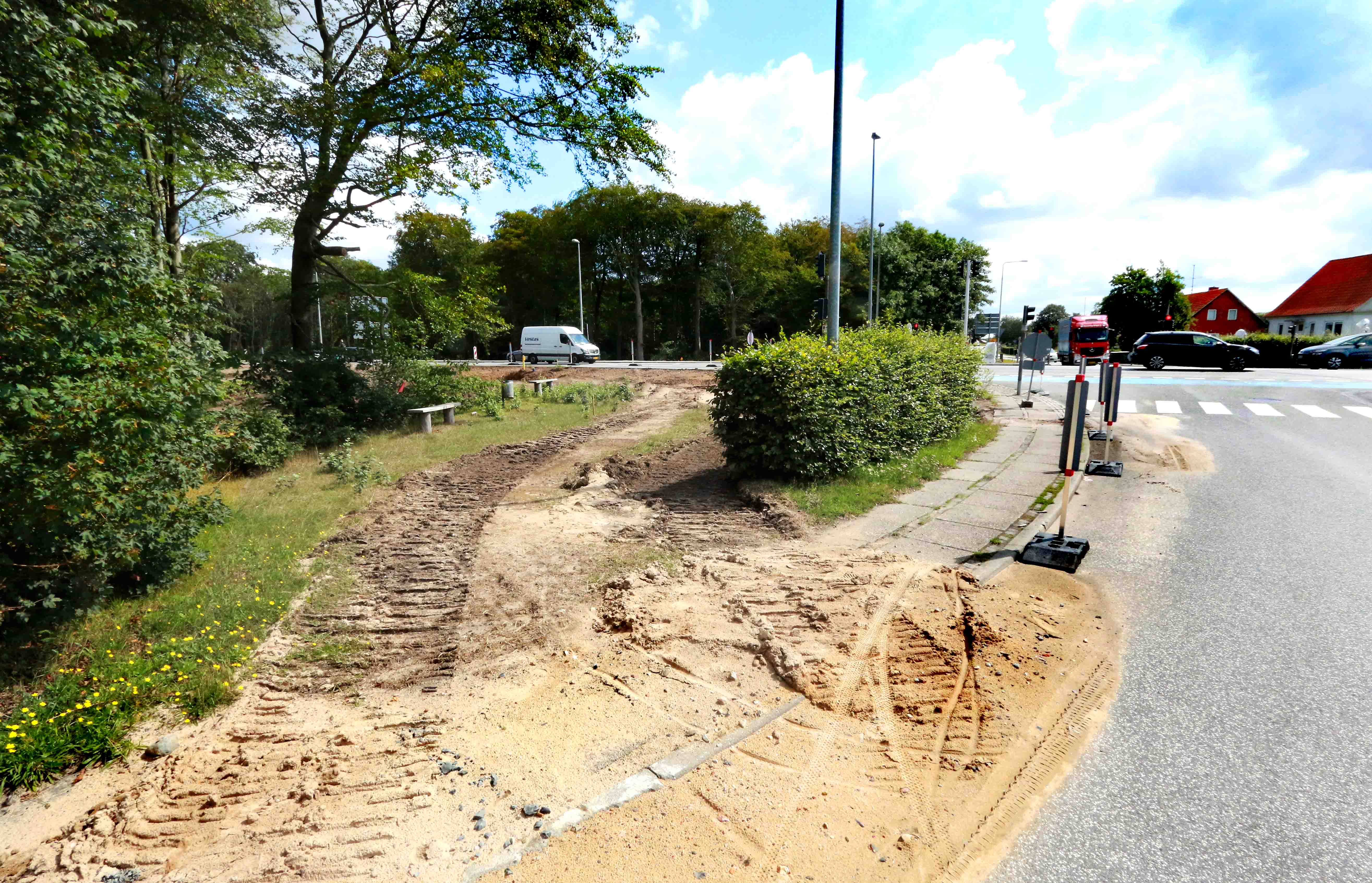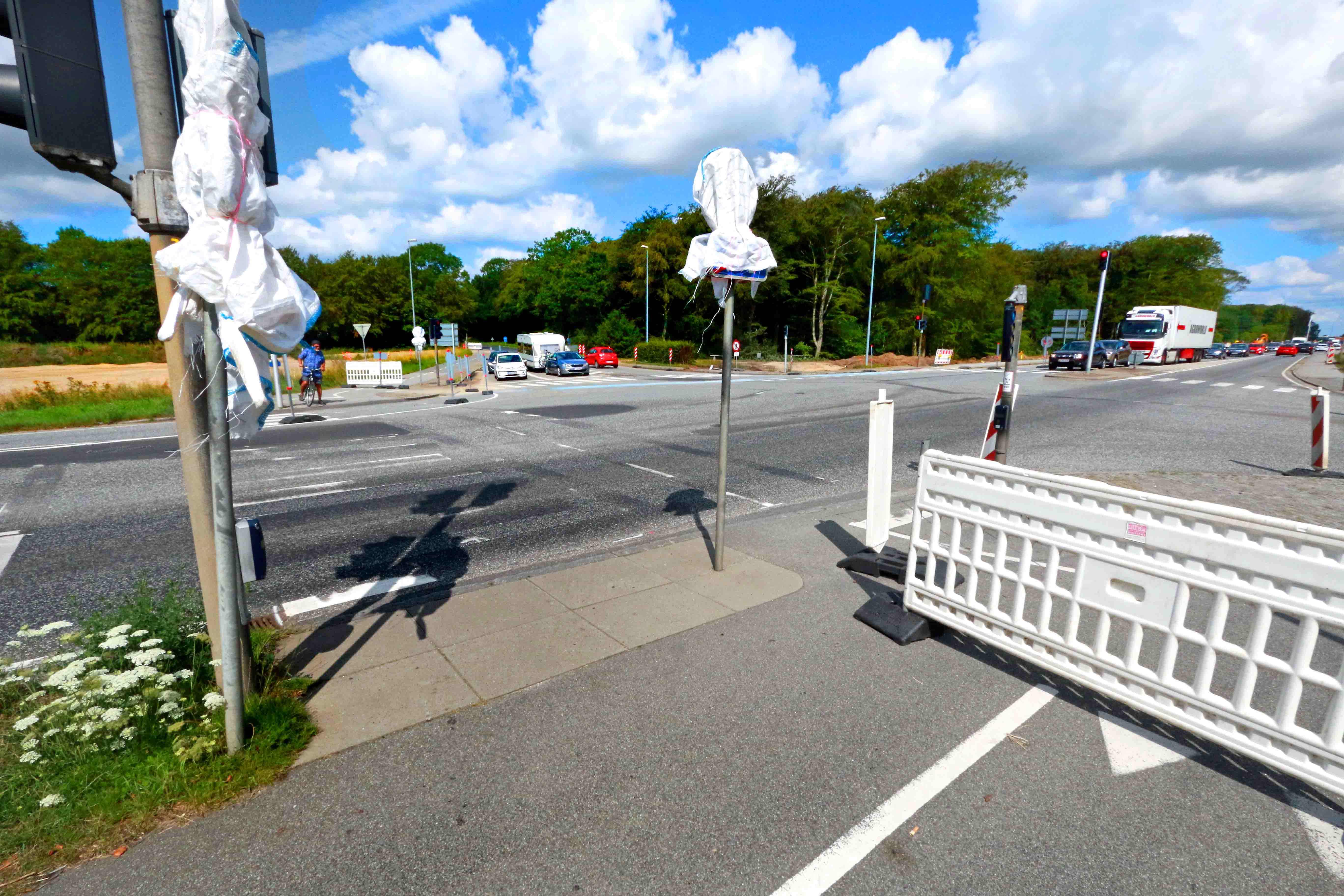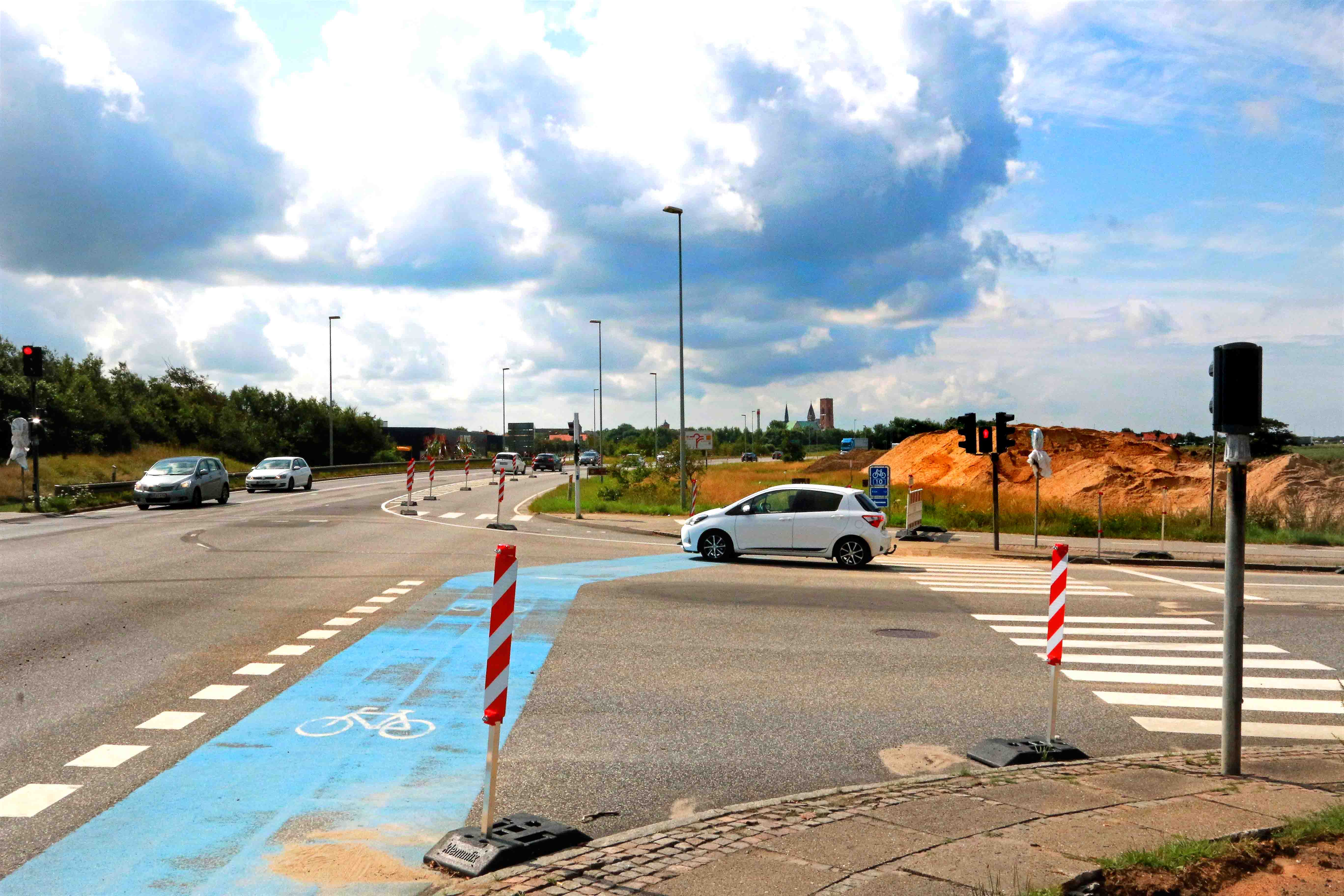 Cyklisterne på billedet kører her frem mod krydset, hvor afmærkningen på vejbanen er fjernet – det samme gælder midterhellen – og så er trafikken på rute 11 skubbet mod øst. I området til højre skal der depotet tømmes for sand – og så skal CG Jensen i gang med at “hamre spunsvægge ned” samt anlægge bassin til regnvand. (Se tidligere artikel).