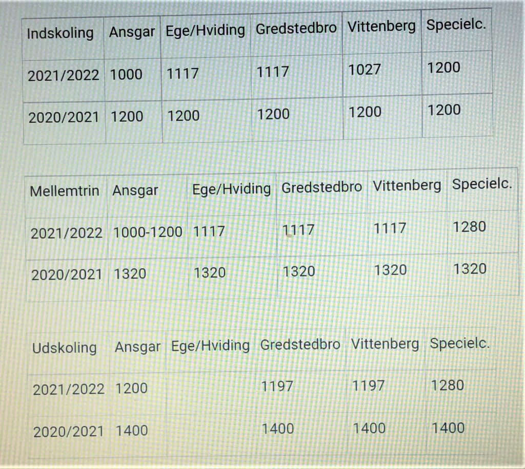 Hvor meget kortere, dagene bliver, er individuelt fra skole til skole, idet der er kommet forskellige indstillinger til byrådet fra de enkelte skoler. Det er også forskelligt fra klassetrin til klassetrin, idet skolerne opdeler eleverne i indskolingsafsnit, mellemtrin og udskolingsafsnit.