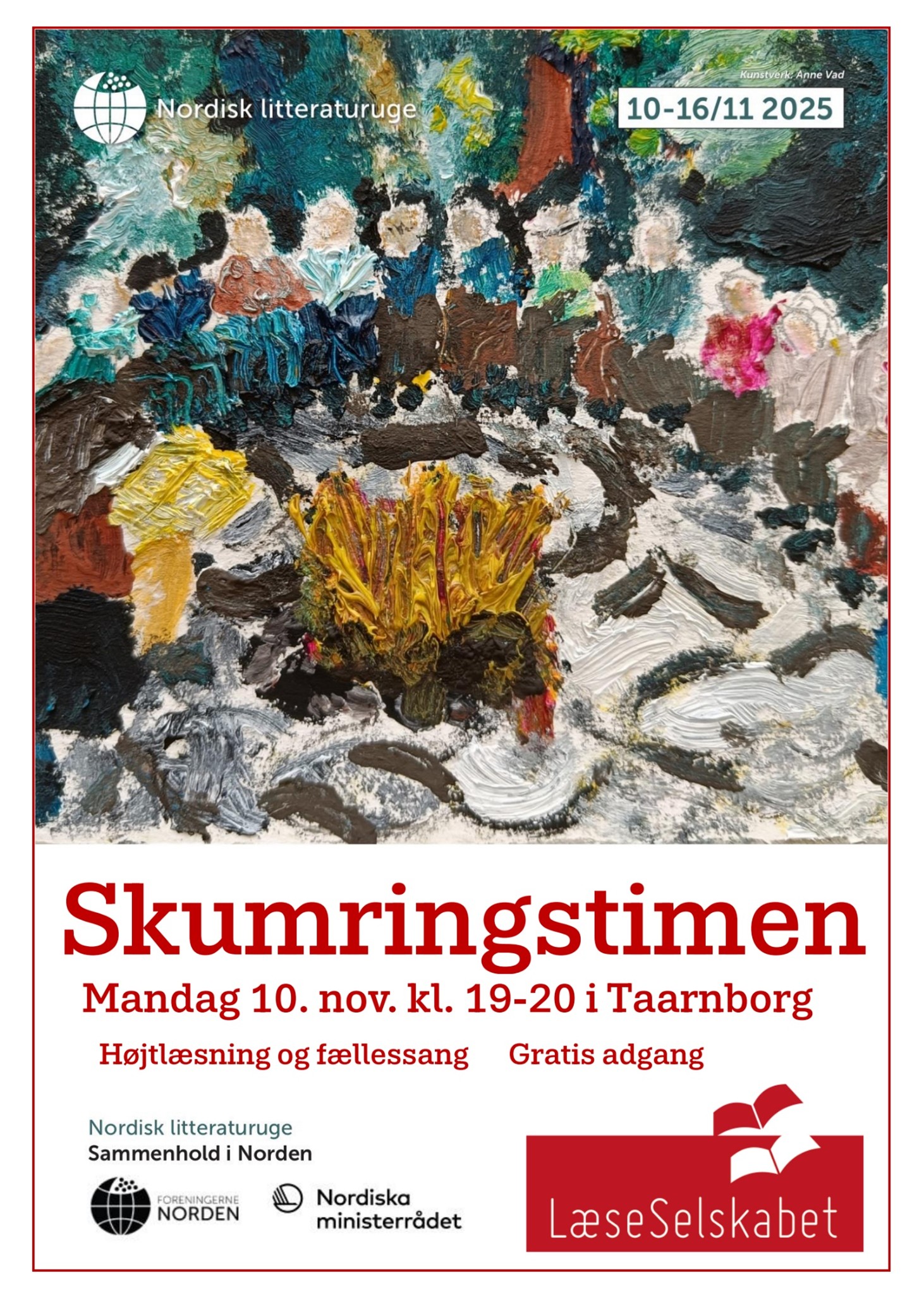 LæseSelskabet inviterer igen i år til den traditionsrige Skumringstime, som er en del af Nordisk Litteraturuge – et fælles nordisk initiativ, der blev startet af Foreningen Norden i 1997. Hvert år samles mere end 150.000 mennesker over hele Norden for at lytte til den samme tekst, læst højt på samme tidspunkt.