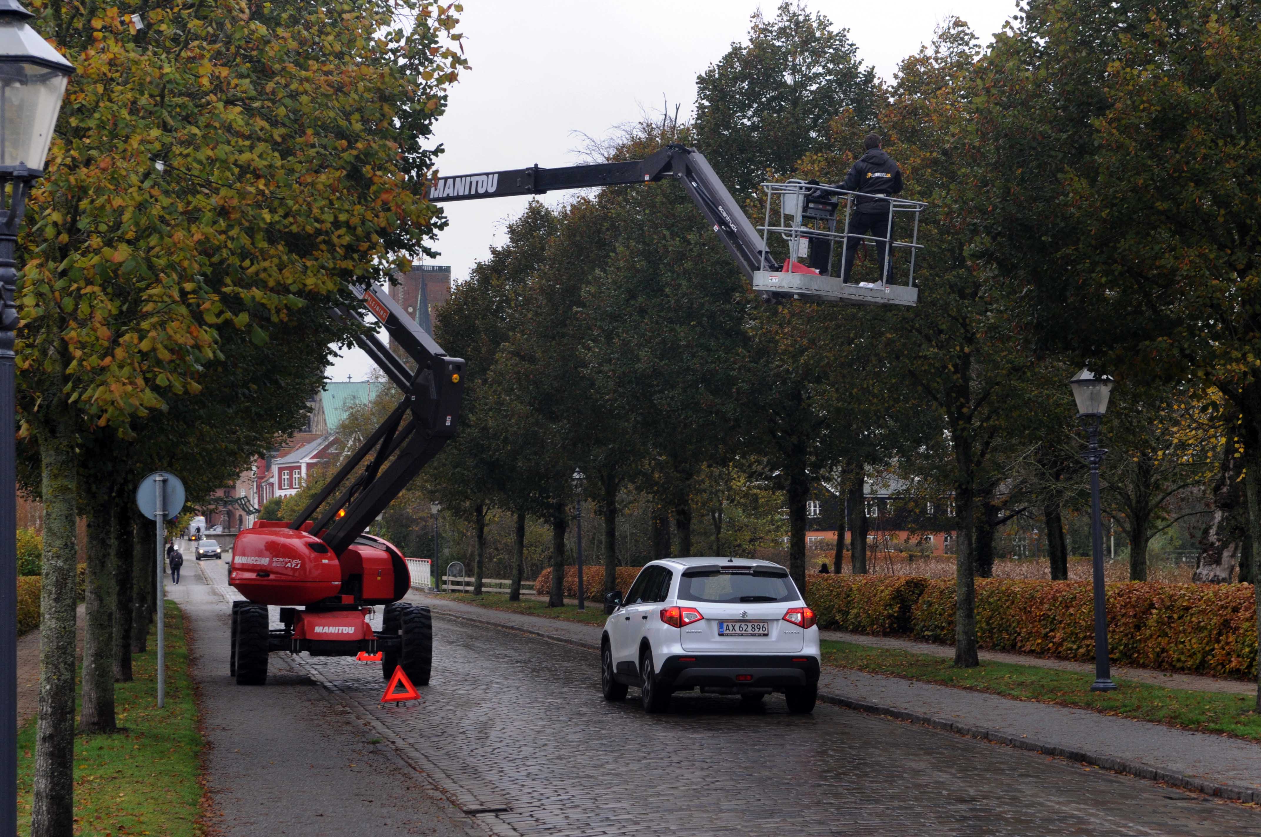 Nu var Dagmarsgade nok i dag heller ikke lige så nem at passere for den store PostNordbil: I den ene side var en lift parkeret og kurven sendt over på den anden side af vejen godt gemt mellem træerne. Der stod Jacob fra El-firmaet JP i gang med at sætte lyskæder op i de flotte træer langs vejen – et job, der nok for de fleste ville virke lidt rystende. Bare tanken om hvad der ville ske, hvis nogen overså afmærkningen og buldrede ind i liften. Det rørte nu ikke Jacob, sagde han med et smil, mens der blev arbejdet flittigt videre med at vikle lyskæderne ud og fastgøre dem i træet.