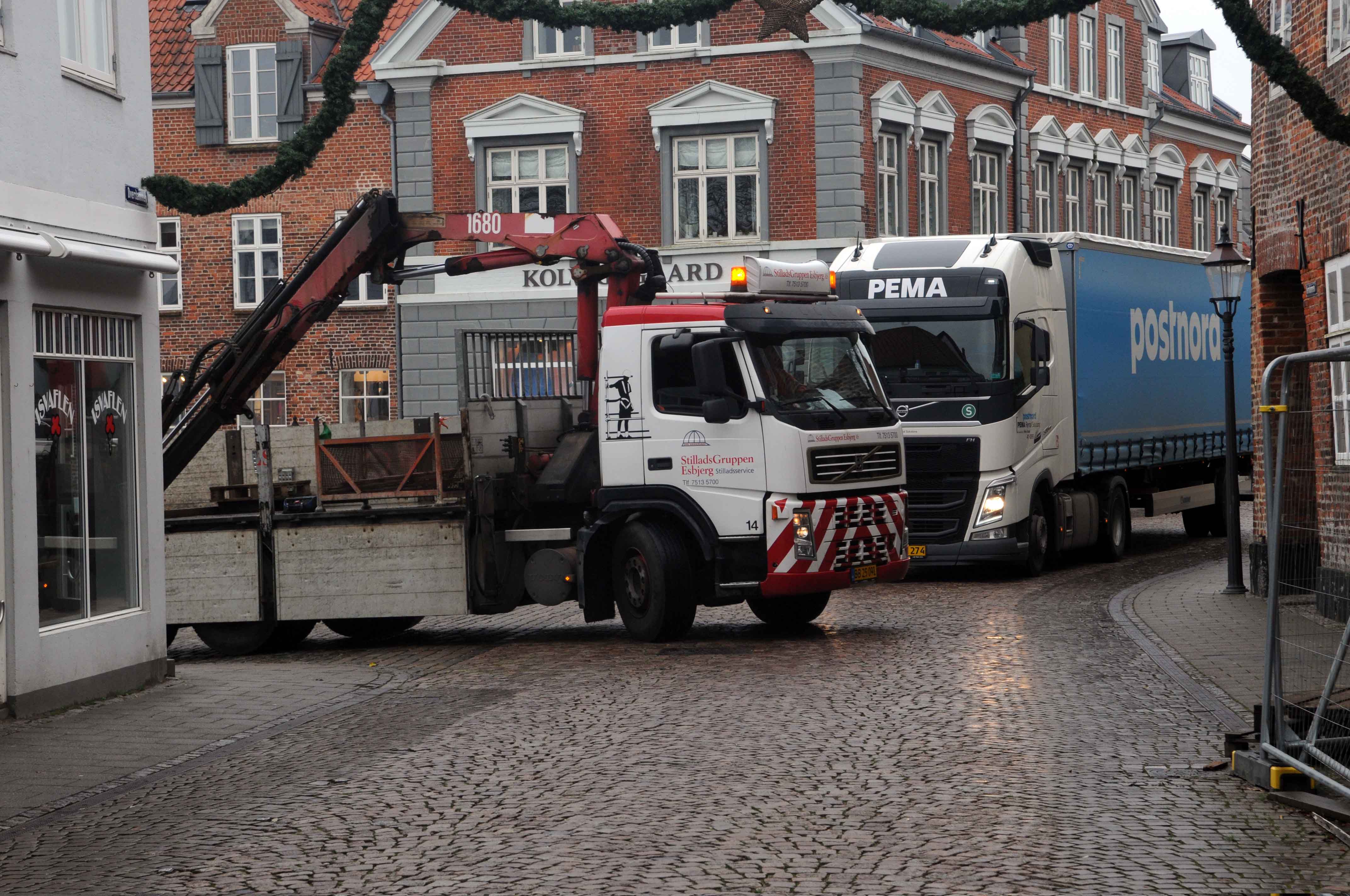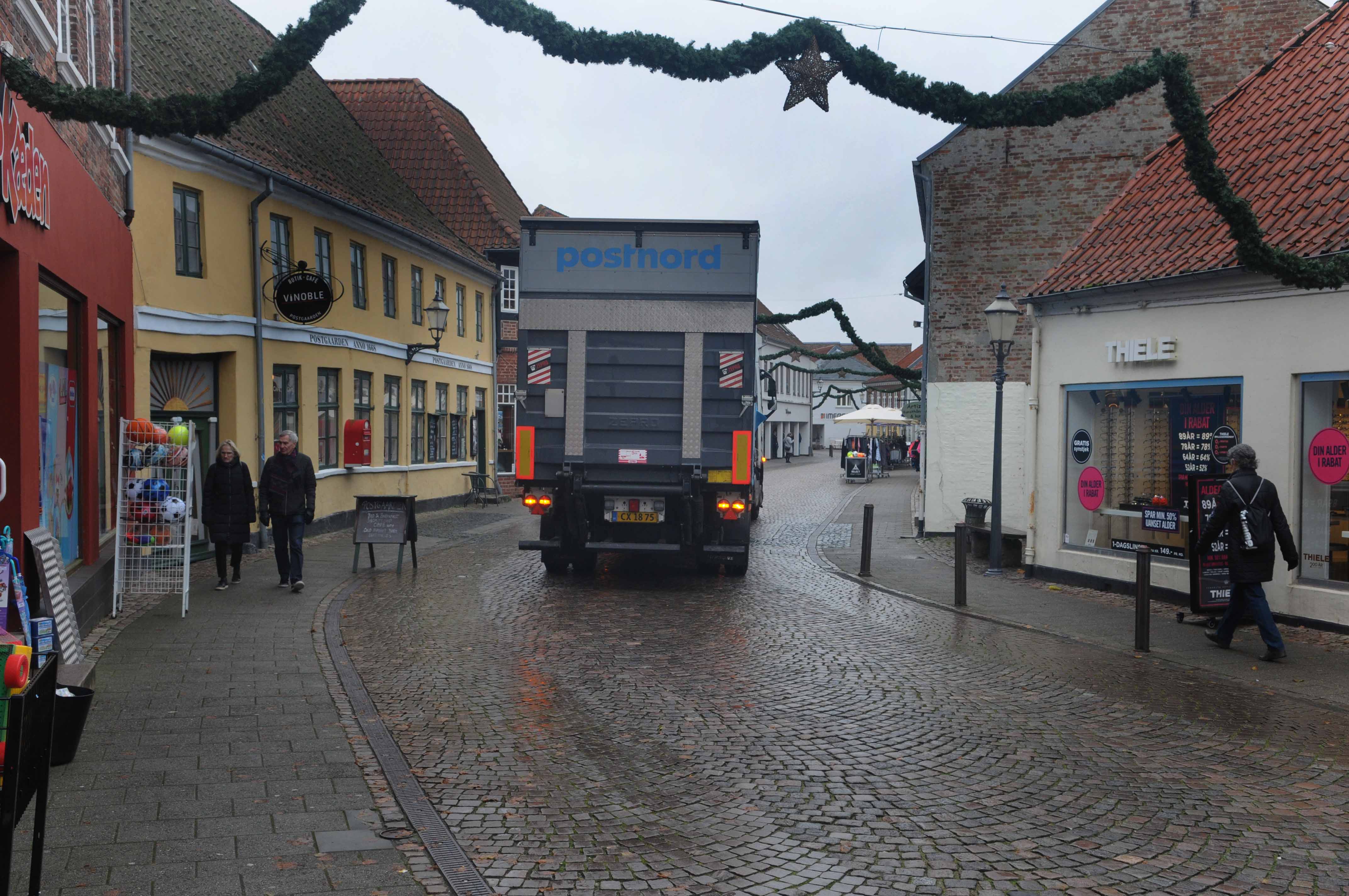 Helt anderledes liv var det i gågaden med modtagelse af varer. Her var smidigheden sat på prøve, da PostNord med den store lastbil ikke kunne komme igennem gaden – en stilladsbil var ved at læsse af i Fiskergade. Hvad gør man så? Nu kunne postmedarbejderen jo ikke vide, han kun kunne køre til Skibbroen – så for at være flink stoppede RYK IND RIBEs reporter chaufføren og fortalte, at han ligeså godt kunne opgive sine planer.
