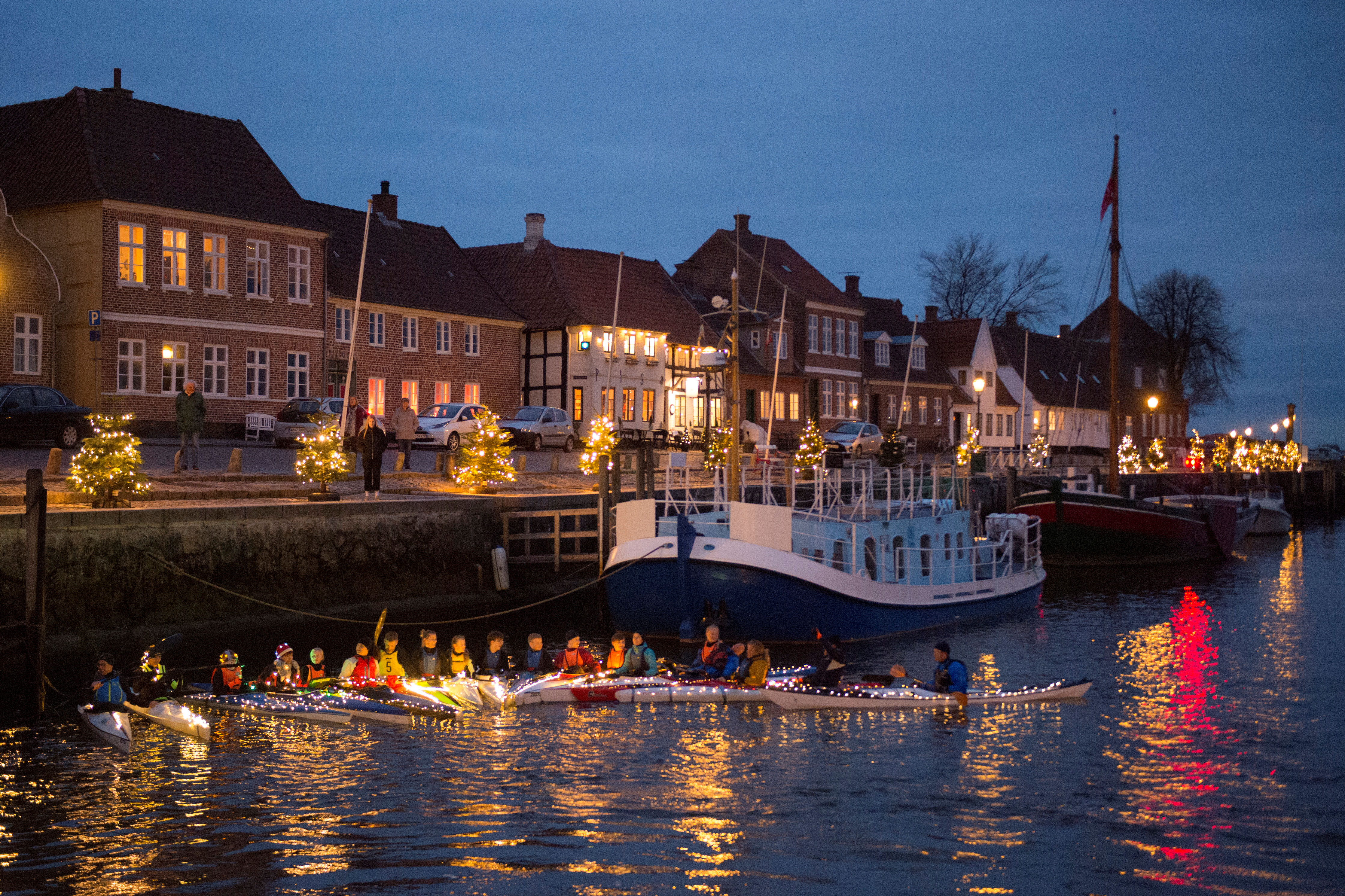 Det var Ribe Domkirkens børne- og ungdomskor, der gik Luciaoptog i gågaden, mens medlemmer af roklubben kom sejlende i en halv snes festligt pyntede og oplyste kajakker. De lagde til ved Skibbroen, og både medlemmerne af Roklubben og børne- og ungdomskoret sang den smukke Lucia-sang, der lød fantastisk i den julesmykkede by.