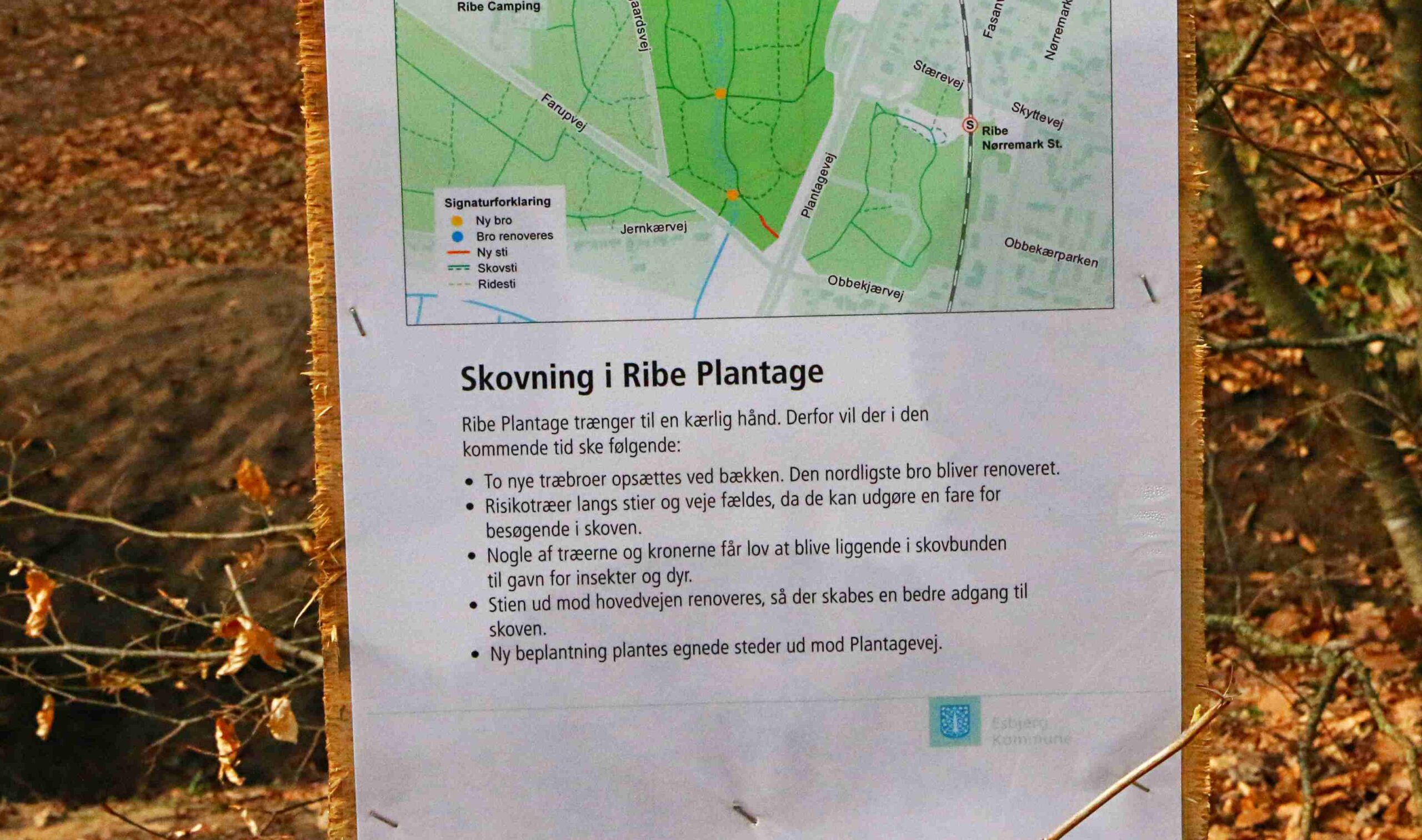 Et skilt fra Esbjerg Kommune fortæller, at Ribe Plantage trænger til en kærlig hånd! Og fem dots beskriver de tiltag, som vil blive iværksat. Arbejdet er allerede godt på vej, men mere følger. Budskabet er biodiversitet og sikker færden i skoven, hvor bla. krydsning af bækken kan foregå over nye træbroer. Foråret trækker mange besøgende, som nyder roen – og børnene elsker at finde motiver i gamle rødder og træstubbe. Kun langs vejene er der en vis uro med “snakkende” råger.