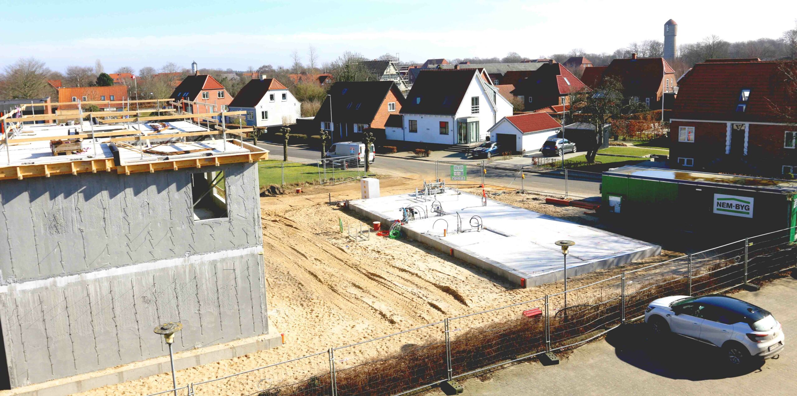 Michael Nørgaards byggeri i Tvedgade har fået rejst 2 bygninger – og torsdag blev der arbejdet med taget. Ud mod Tvedgade ses fundamentet til endnu en bygning.