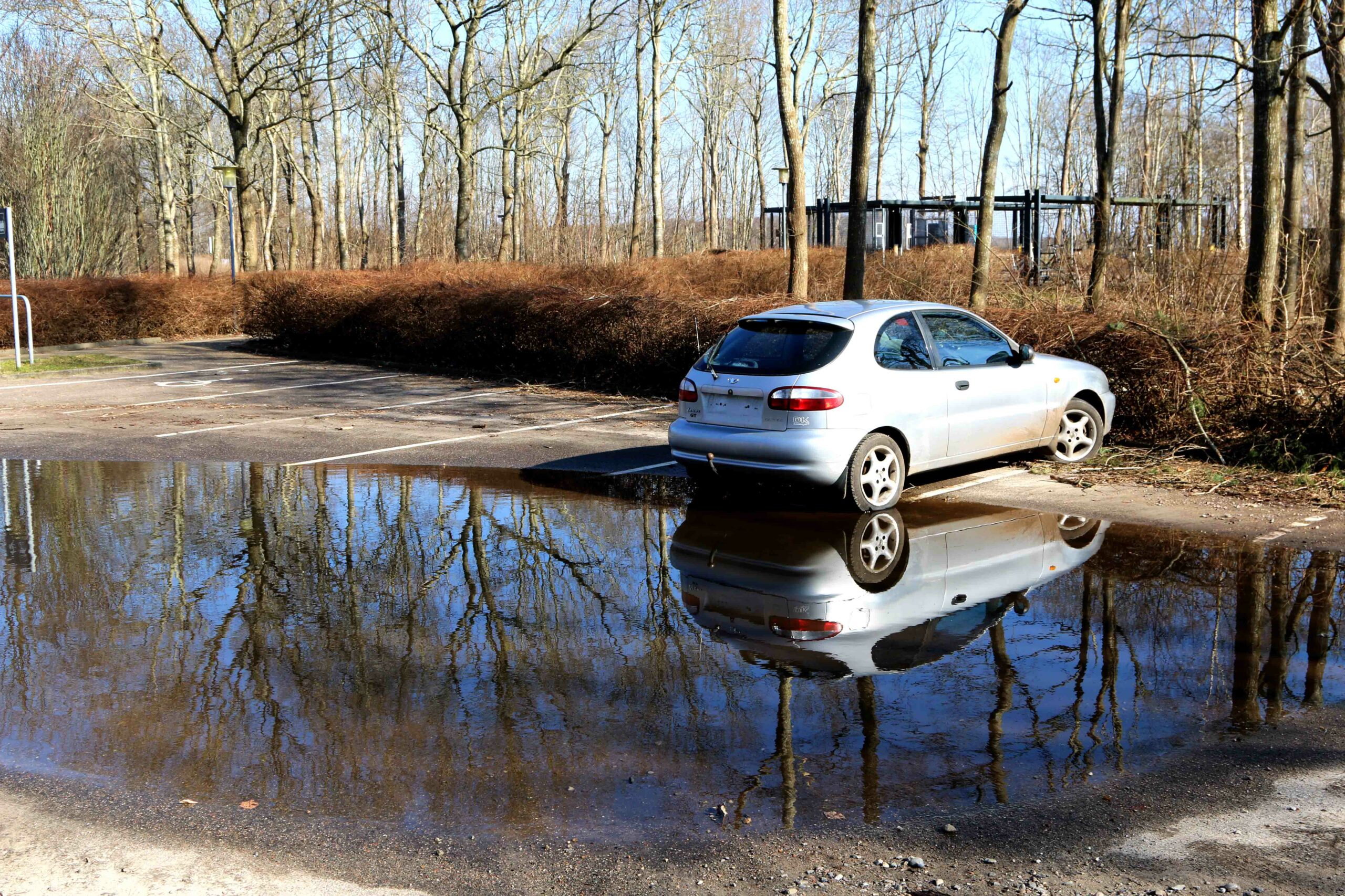 Det er ikke første gang, at parkeringspladsen ved Hviding Station står under vand. Og på stedet er en bil efterladt. I forruden har Politiet påklistret en besked om, at bilen SKAL fjernes inden 48 timer. Imodsat fald vil det blive fjernet af POLITIET for EJERS REGNING.