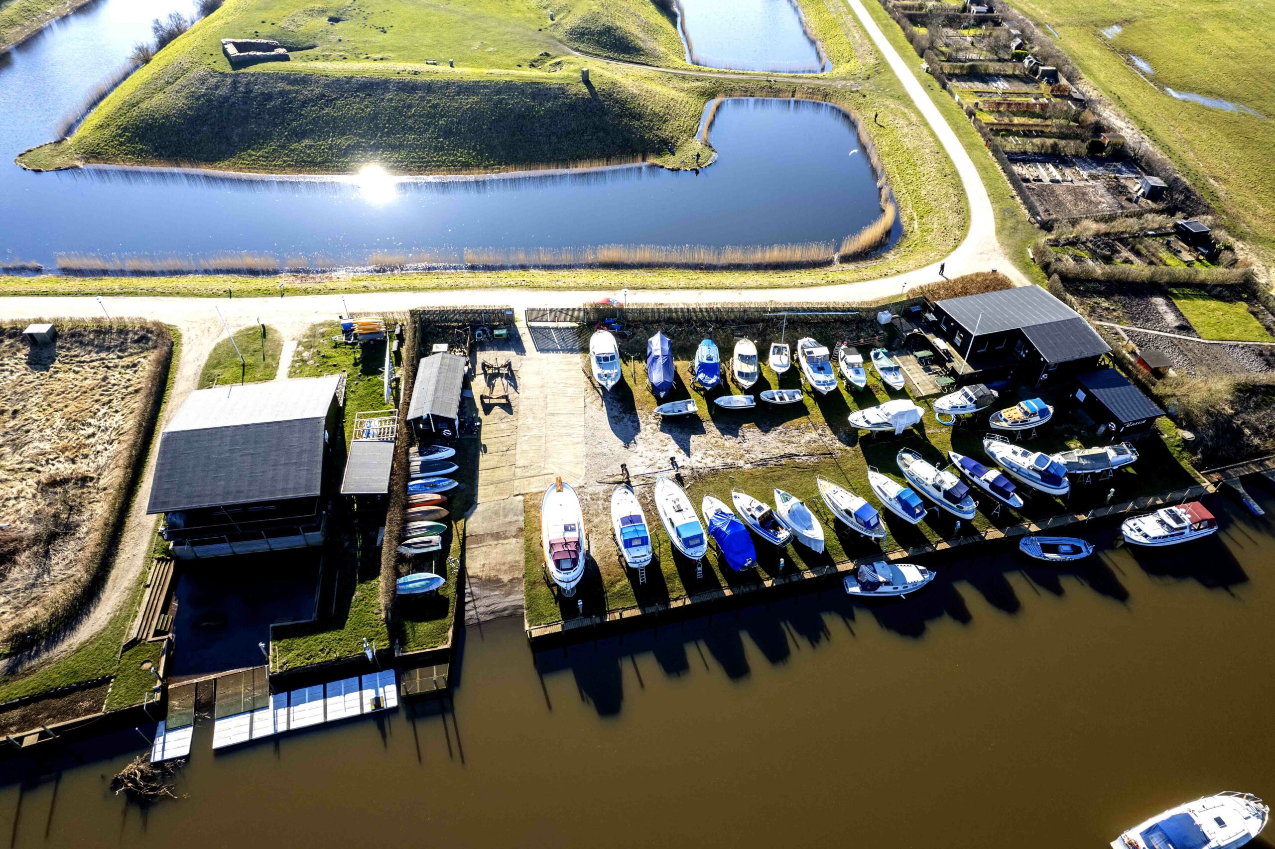 Mange både er i vinterhi på Ribe Sejlklubs areal ved Slotsbanken. De skal i vandet i løbet af april og ud på den anden side af Ringbroen og militærbroerne (hvis de kommer i maj). På billedet ses også Ribe Vesterås eneste slæbested. Formentlig kommer der snart et slæbested ved Kammerslusen.