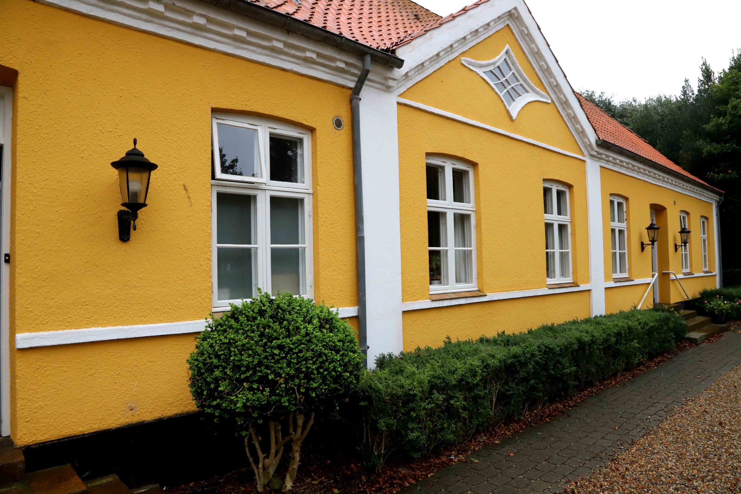 - Præstegårdens hovedbygning er holdt i gul farve …