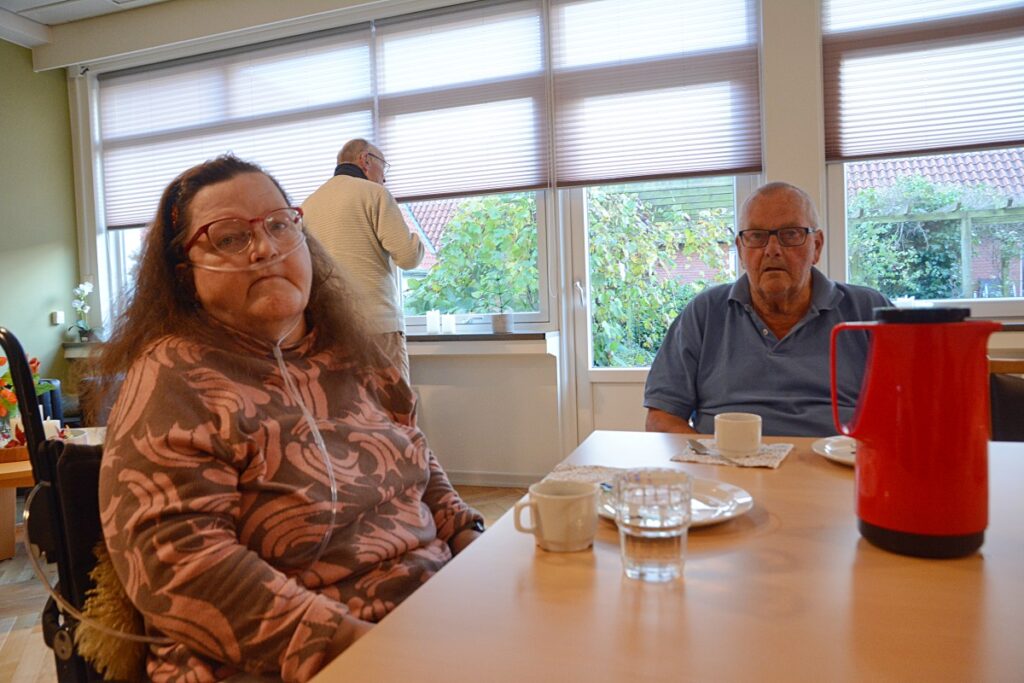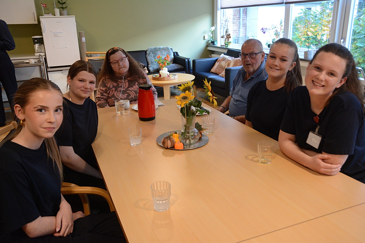 Og mens de fire unge piger taler, sidder to af plejehjemmets beboere, Gitte Røn og Karl Simonsen og lytter og nikker samstemmende.
