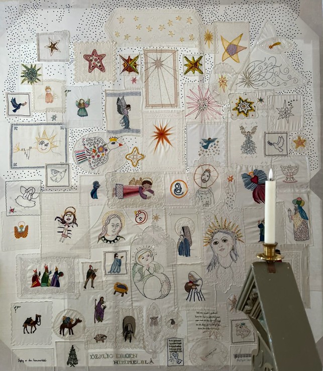 På Limfjordsøen Fur er 29 kvinder gået sammen om at skabe et stort, smukt broderet billede inspireret af juleevangeliet og salmen “Dejlig er den himmel blå”. Over tre måneder har kvinderne hver især broderet deres motiver derhjemme på gamle servietter, lyseduge og pudebetræk, som allerede bar deres formødres fine, hvide broderier. Efterfølgende er de mange dele blevet syet sammen til ét samlet værk. Billedet har været udstillet i Fur Kirke fra jul og indtil for nylig og kan nu opleves i Ribe Domkirke fra 3. marts og under hele festivalen – måske endda helt frem til påske. Der er som bekendt gratis adgang til kirken.