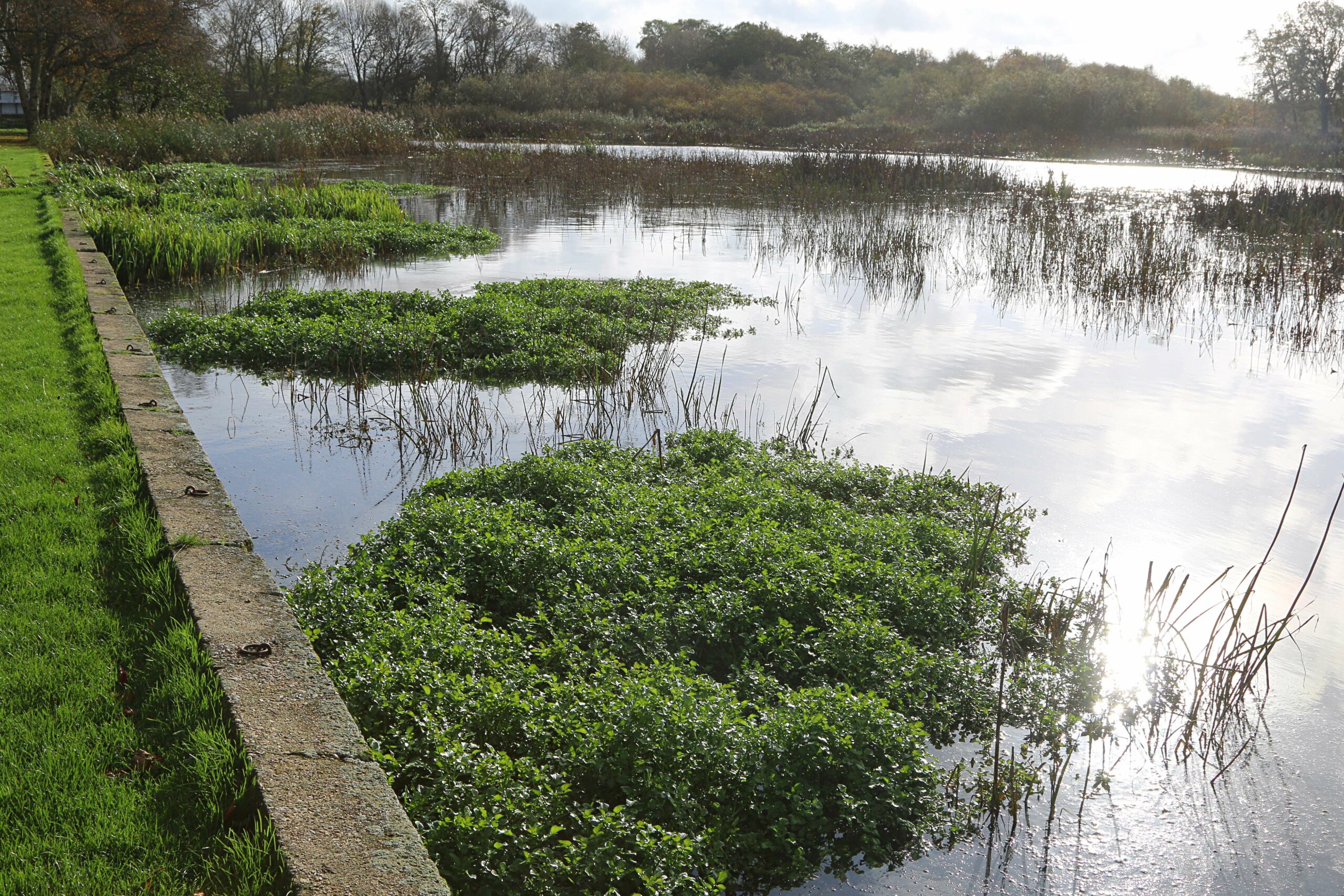 Ser man på Mølledammen netop nu, så er der opstået små øer, hvor der sandsynligvis er samlet en mudret bund med ringe vanddybde. Langs Kurveholmen er der megen vækst og grene – og et enkelt sted ligger en næsten tilgængelig anlægsbro.