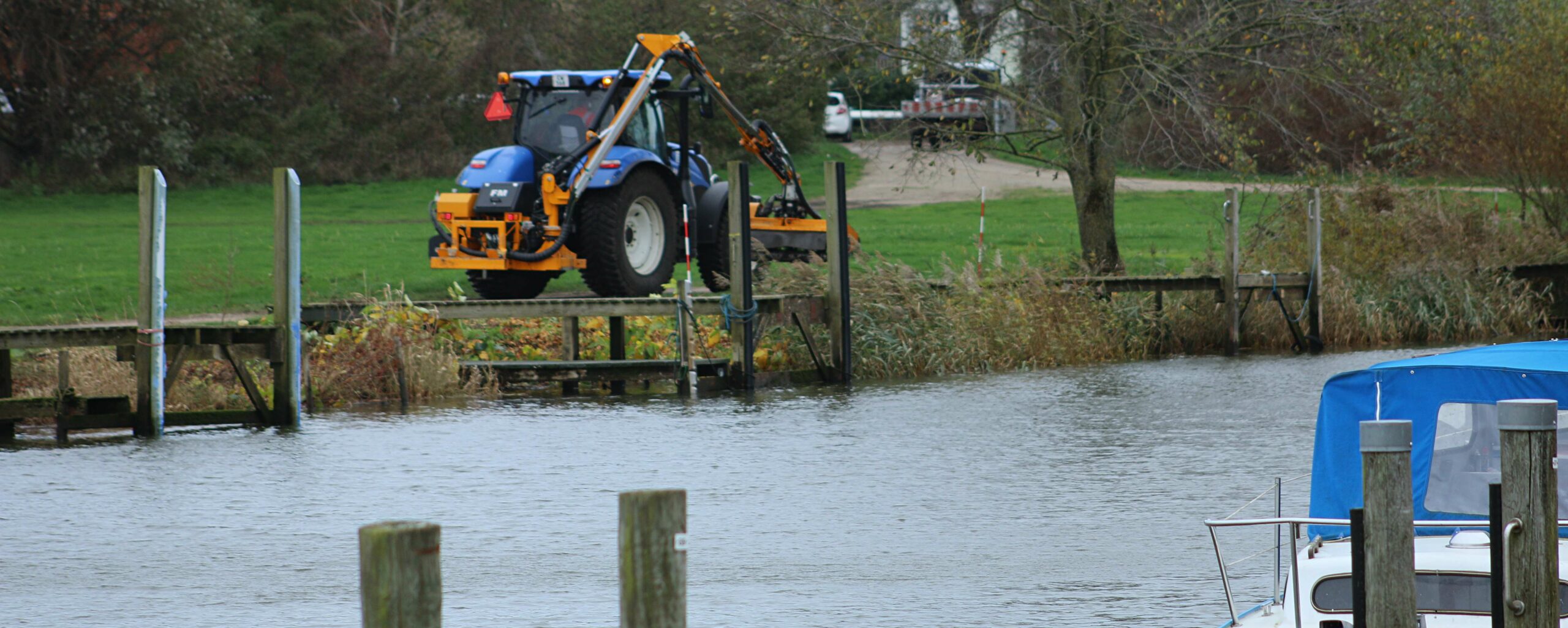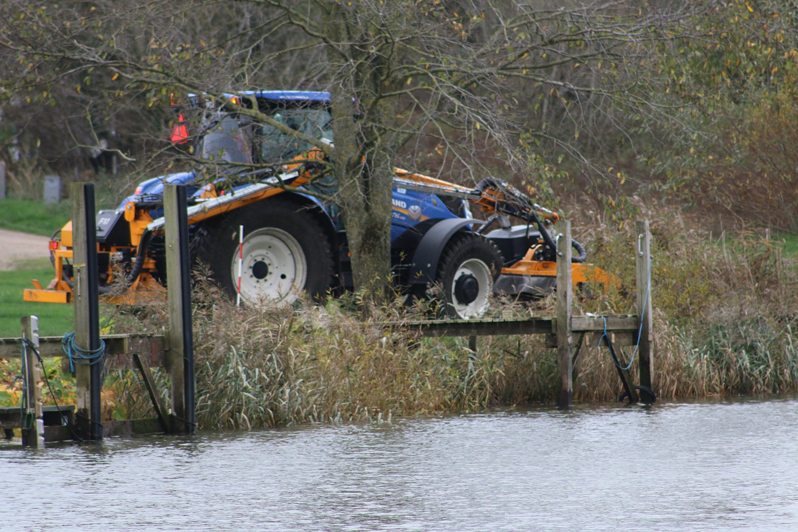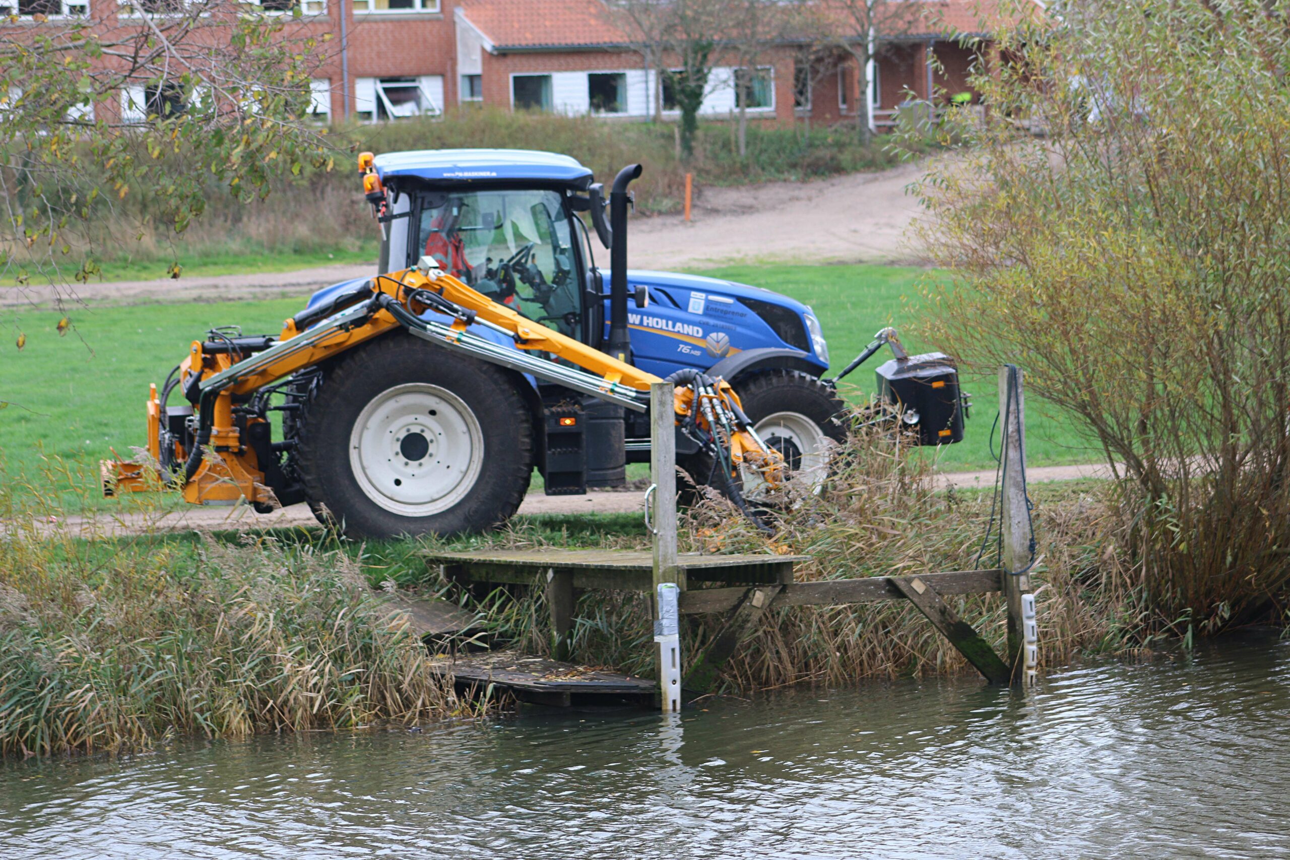 Torsdag fangede RYK IND RIBE en traktor, som var i færd med at klippe græs, siv mm langs åen og dermed fritlægge de mange bådebroer. Formand Lars Buhrkall fra Ribe Sejlklub siger herom: – Det sker på vores initiativ, men efter aftale med flere interessenter. Da der er tale om en kommunal traktor, der udfører arbejdet, var det derfor naturligt at søge en oplysning om omfang og tidsramme hos Leder af Entreprenør Distrikt 5, Hans Korsgaard Laursen. Han fortæller: – Vi blev færdige med at klippe “rabatten” fredag. Vi har klippet så langt ned, som maskinens arm rækker. Han gør videre opmærksom på, at der kommer personale forbi med motorsav i næste uge for at tage de grene, der ikke blev slået med klipper.