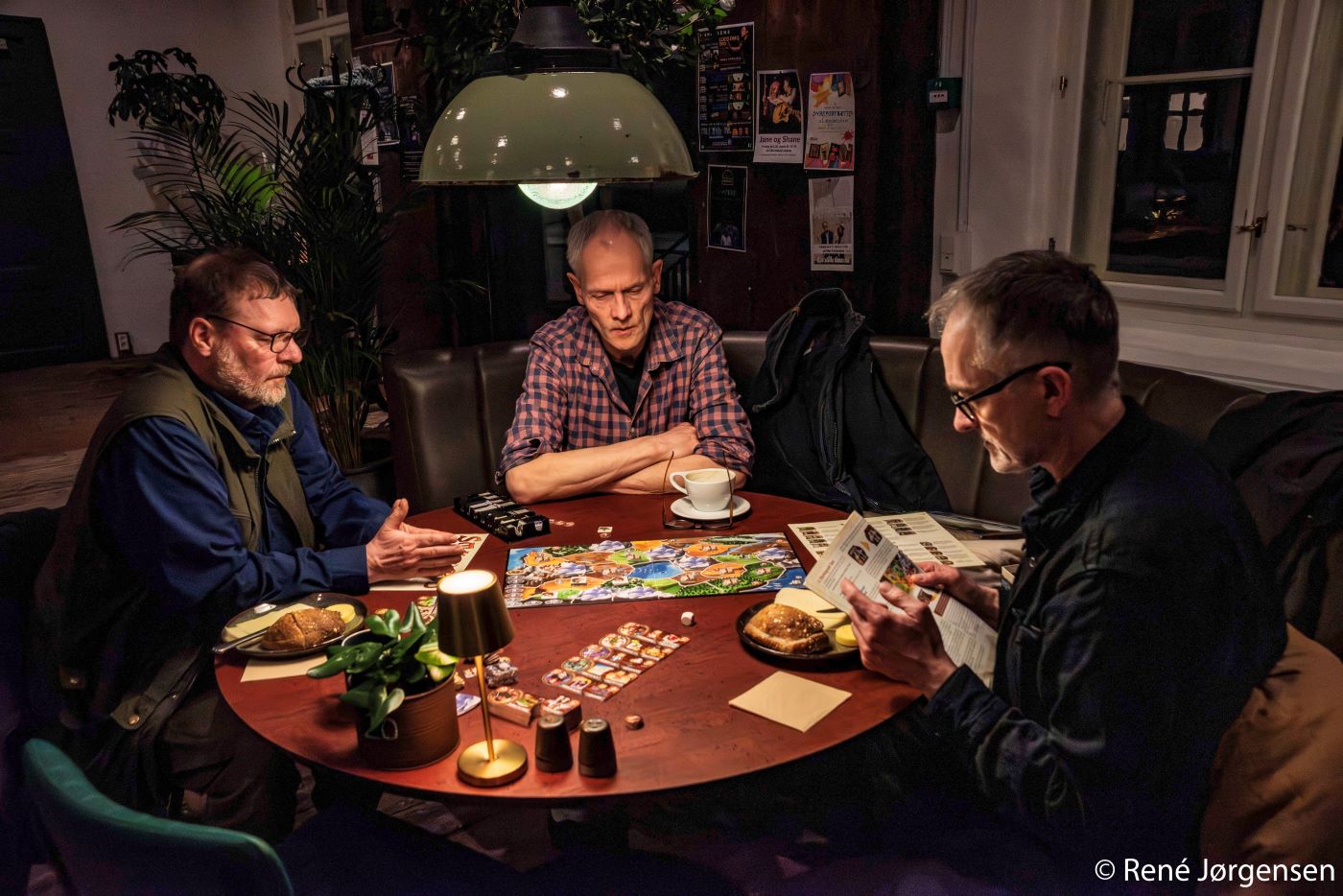 Denne torsdag aften er spillepladen fundet frem ved et af bordene. Asbjørn Holm, Klaus Keller og Lars Erik Hansen er i gang med strategispillet Small World, hvor spillerne kæmper om at erobre områder og opbygge et imperium – i en verden, der er lidt for lille til alle.