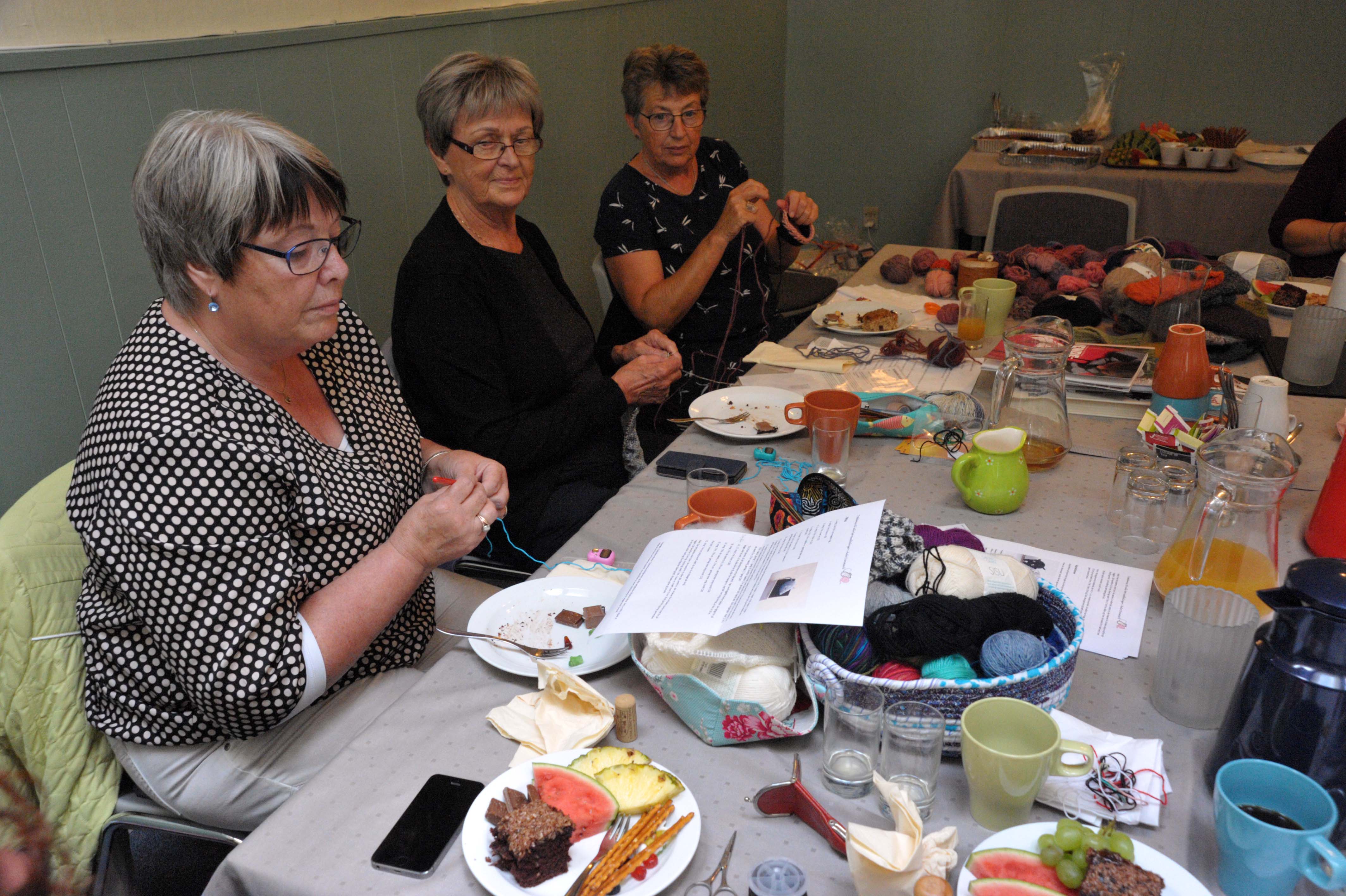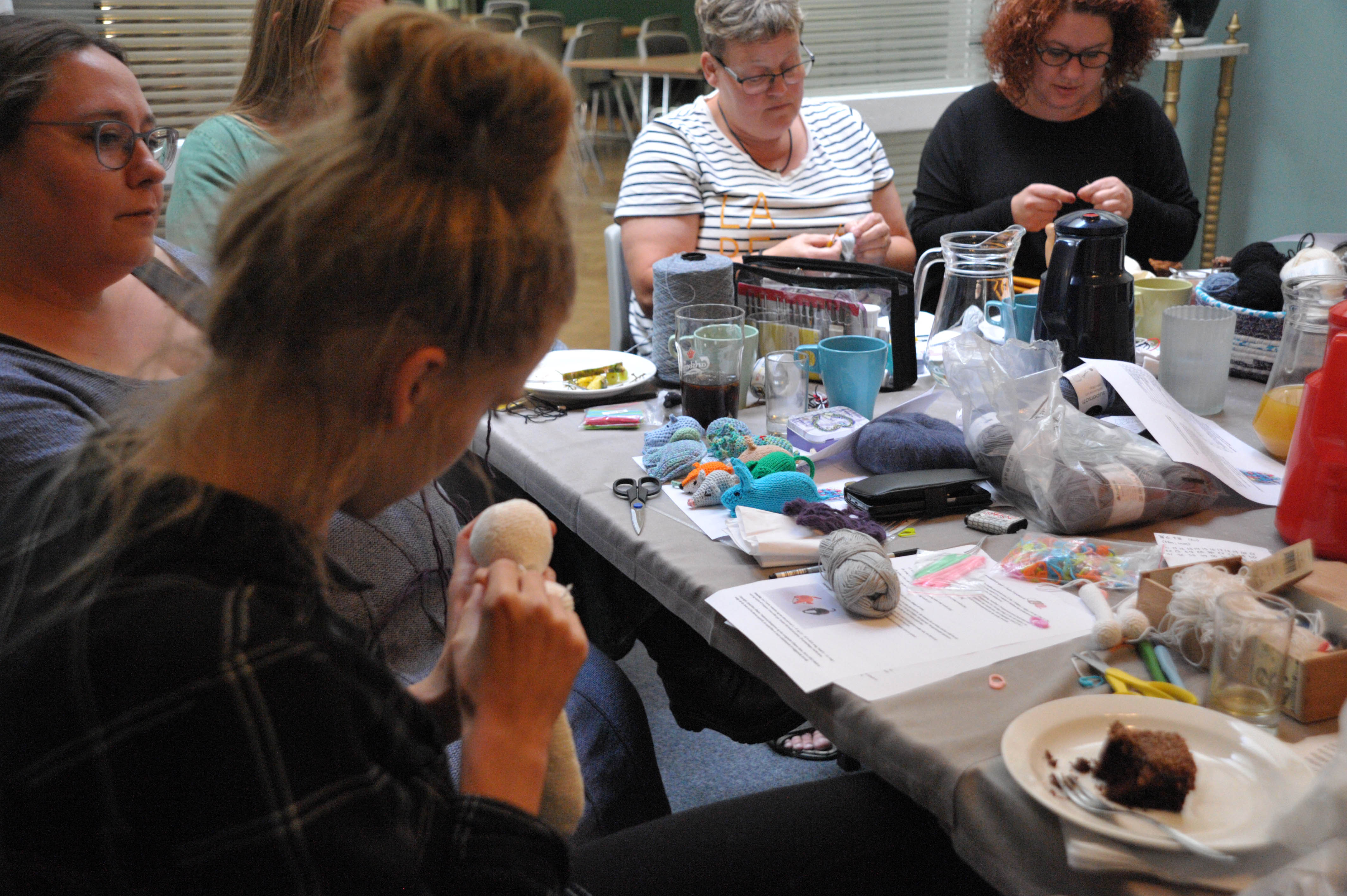 Snakken går lystigt og ingen tvivl om at aktivitetsniveauet er højt, for bordet bugner af garn og andet nørklemateriale.