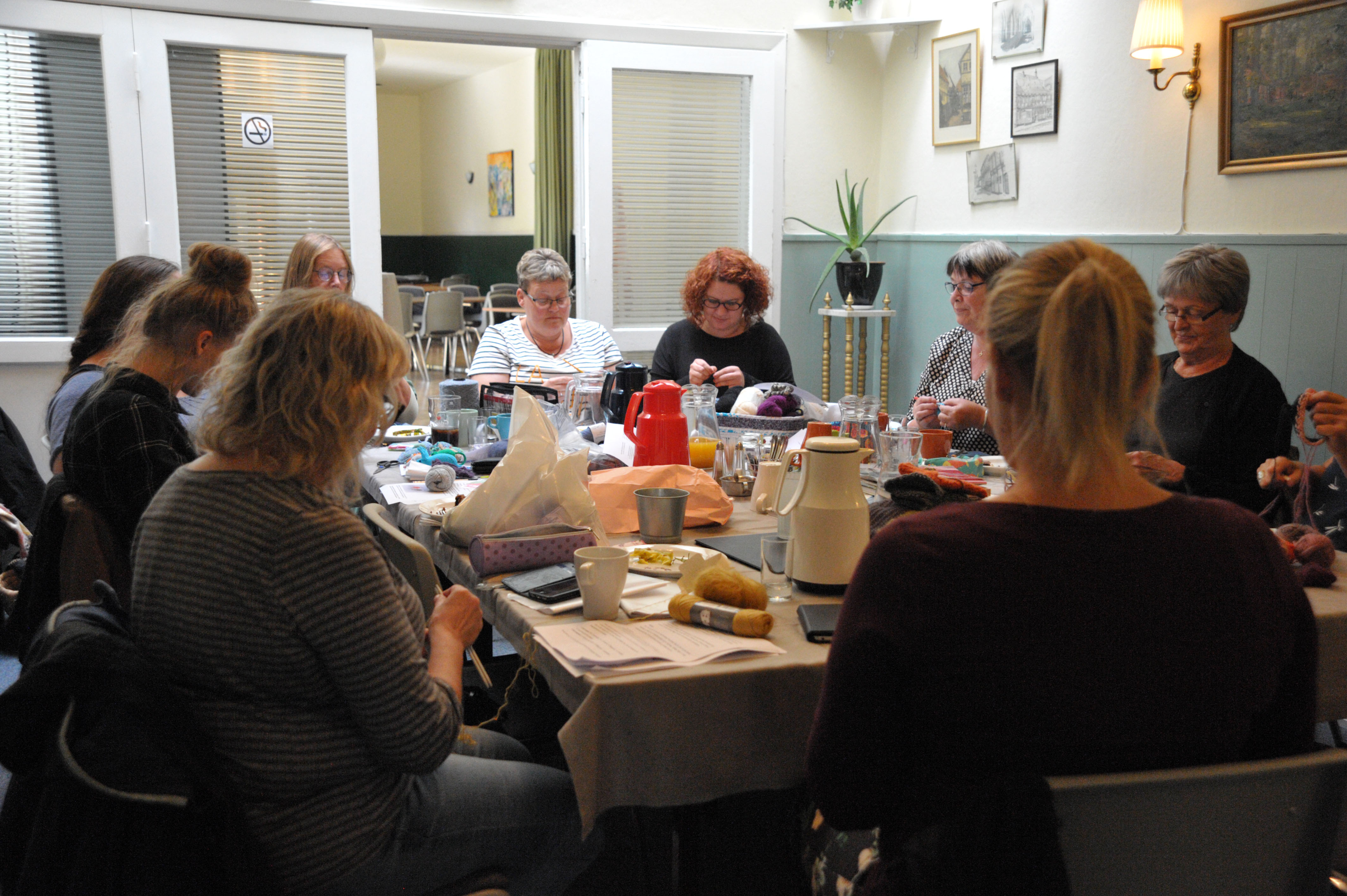 Denne regnfulde lørdag eftermiddag møder vi 10 herlige kvinder i alderen 23 – 76 år, i gang med strikkepindende, for det er dagen, hvor nørklemaratonen skal afholdes i 12 timer fra kl. 9.00 til kl. 21.00.
