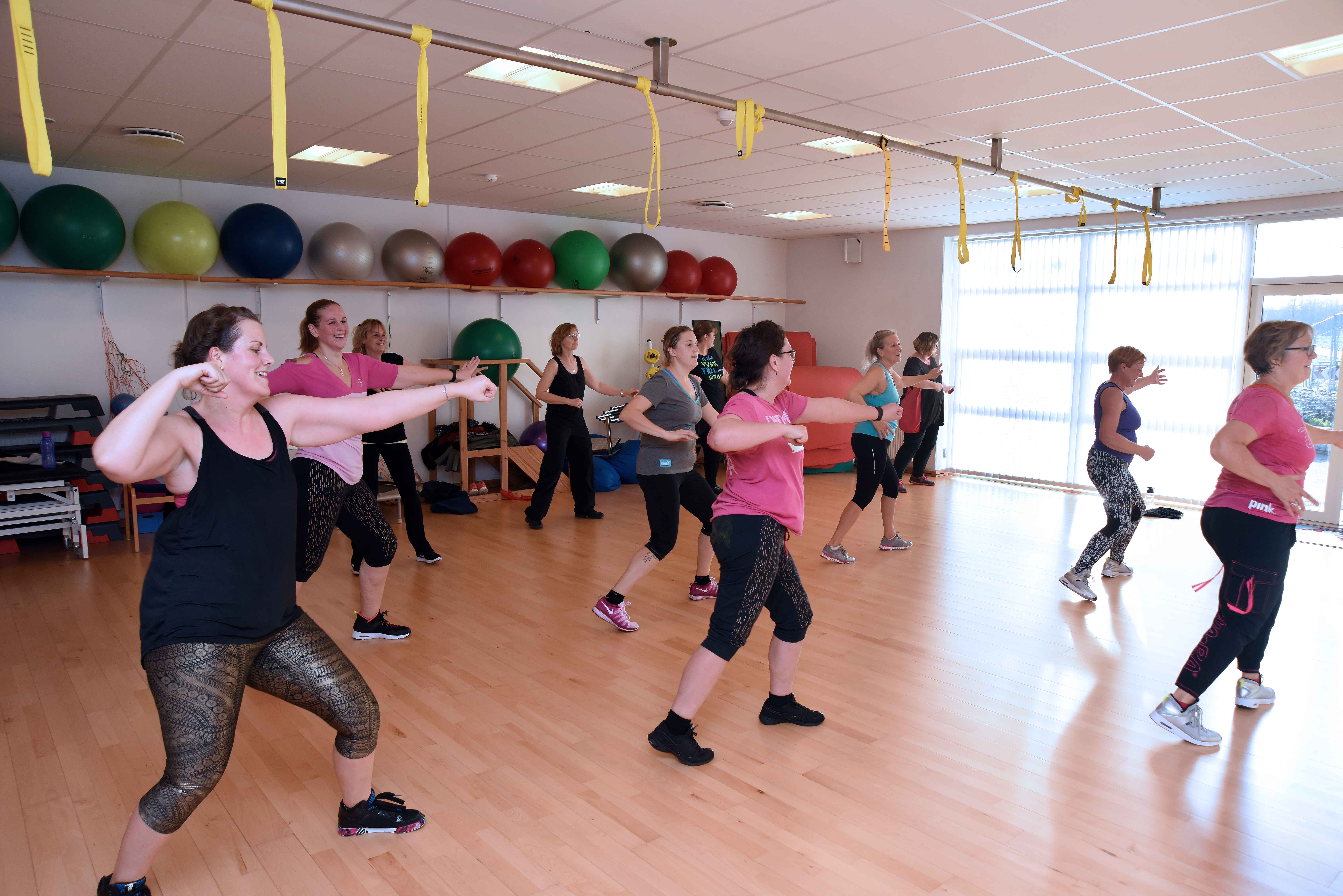 Zumba-kvinderne imponerede i lokalet ved John Bruuns Klinik for Fysioterapi. Selv om de arbejdede, så sveden sprang, var der overskud til et smil til fotografen, mens arme og ben røg i alle retninger. Og ikke nok med det.