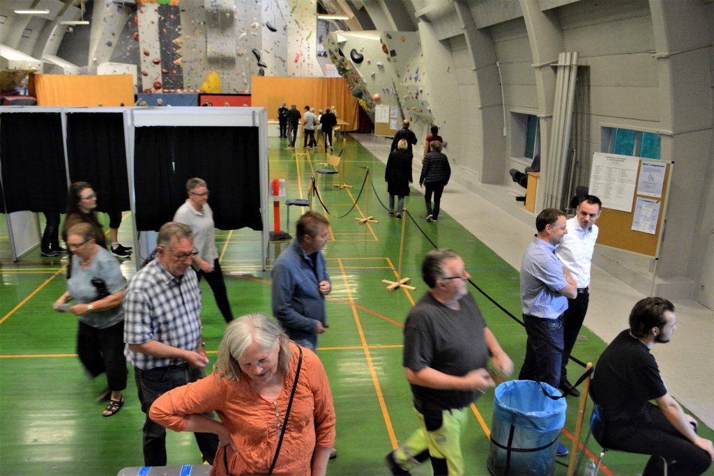 Skoleelever var mødt op for at få anskuelighedsundervisning i den del af demokratiet, som en valghandling nu en gang er. Og ellers blev der tid til en snak, når venner og naboer mødtes på vej til eller fra valglokalet, hvor der til tider var kø for at komme til valgbordene og få stemmesedlen udleveret.