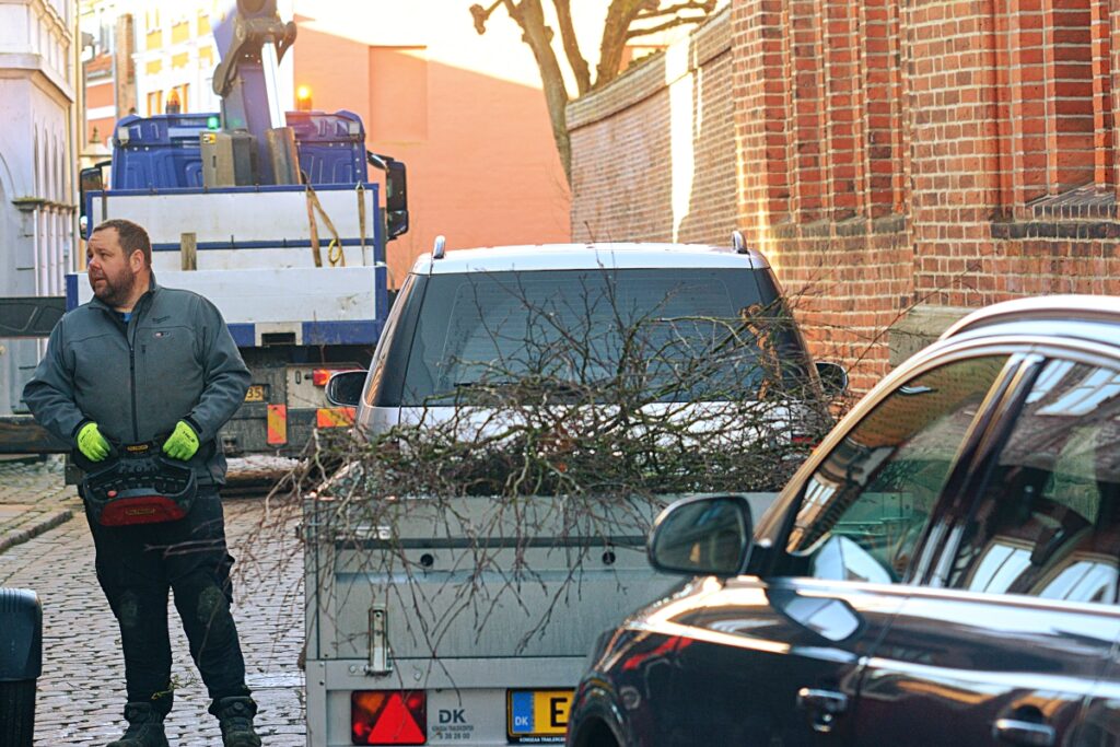 Nedenfor ser redemester Ove Beck til, at alt går rigtig for sig mens Michael Voigt styrede granen ved siden af traileren med grene og andet, der skulle bruges til istandsættelsen af storkenes boliger.