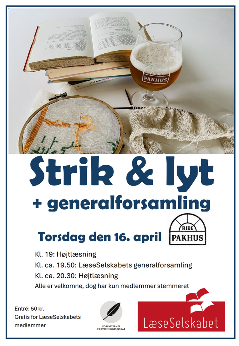 Torsdag den 16. april kl. 19 er det igen tid til at samles omkring højtlæsning i LæseSelskabet, gerne med et strikketøj eller et broderi i hænderne. Som sædvanlig er det Ribe Pakhus, der lægger lokaler til, og det er stadig en god idé at komme i god tid og sikre sig en god plads – og få købt drikkevarer i baren.