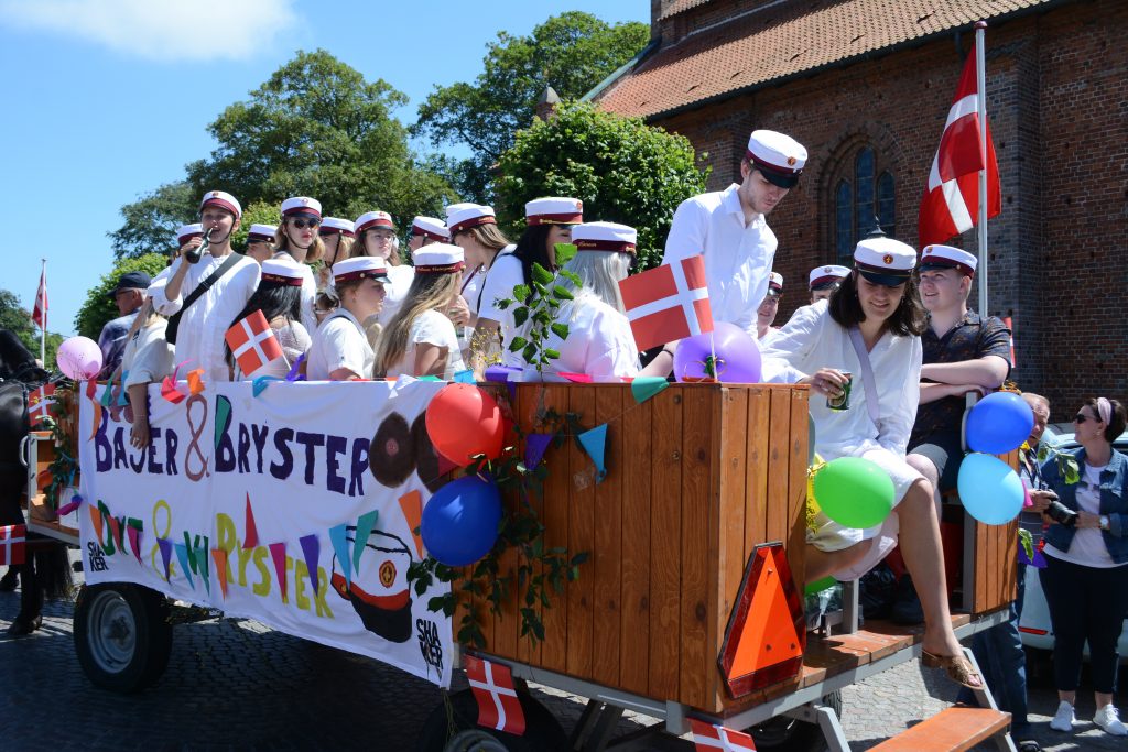 Der blev danset om springvandet, og enkelte var også lige oppe og få tæerne dyppet, inden turen i hestevogne og en gammel militær lastbil gik videre rundt til de mange forældre, der ventede med forfriskninger.