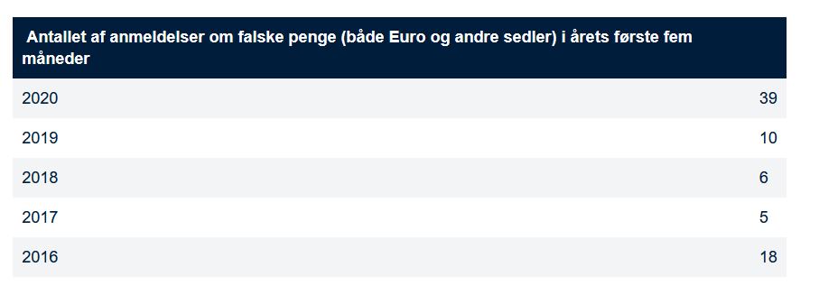 Således modtog Syd- og Sønderjyllands Politi i alt 39 sager om falske penge (både Euro og andre sedler) i de første fem måneder af 2020, mens det tilsvarende tal i samme periode året før lå på 10.