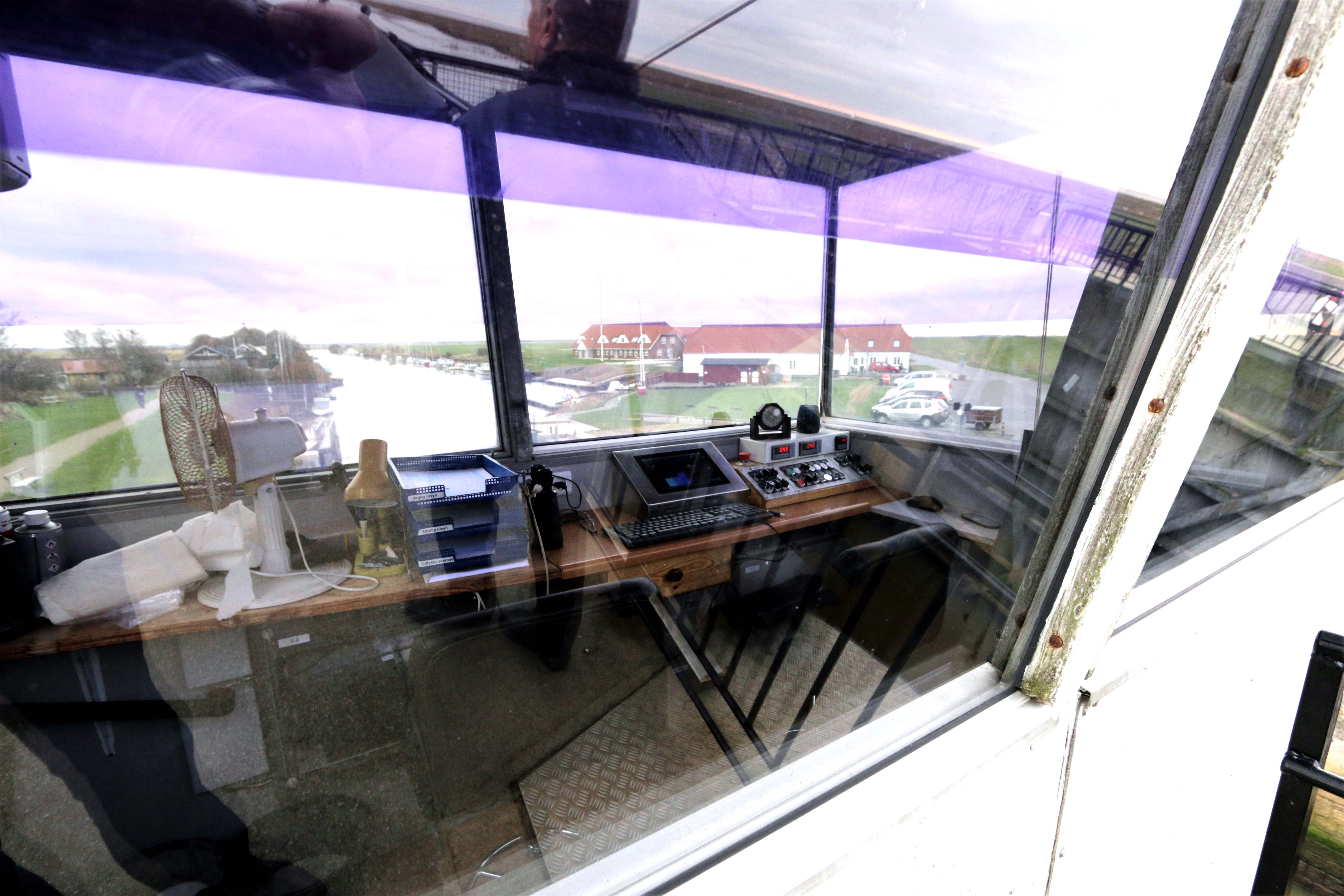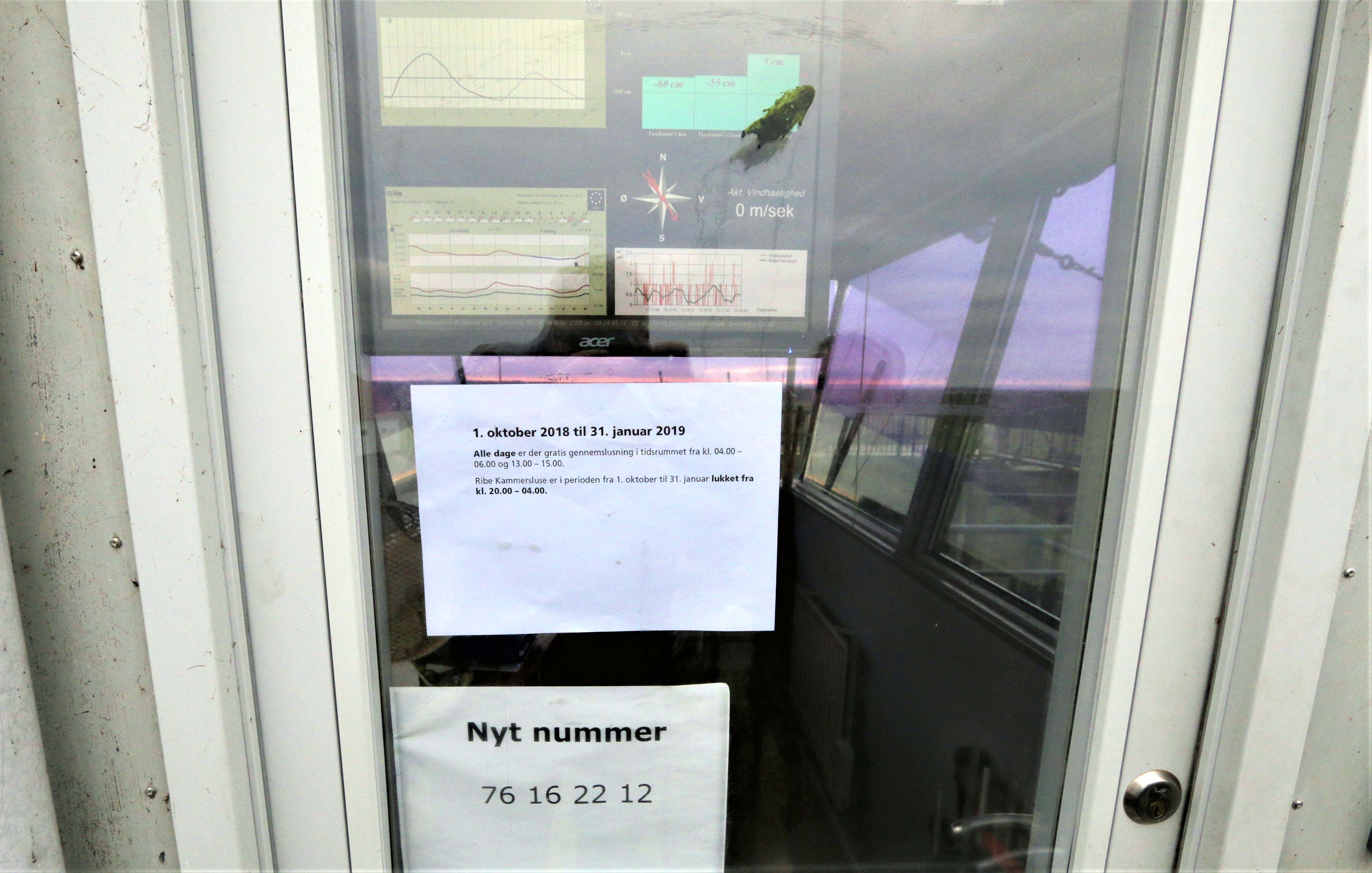 På døren ind til ”kommandobroen” hænger en oversigt om vandspejlet foran – midt i – efter slusen. Da RYK IND RIBE besøgte slusen 12. december, var den åben og åvandet strømmede ud. Det så ud, som om måleenheden uden for slusen var ude af drift – er det korrekt? Og hvilken betydning har det for sikkerheden?