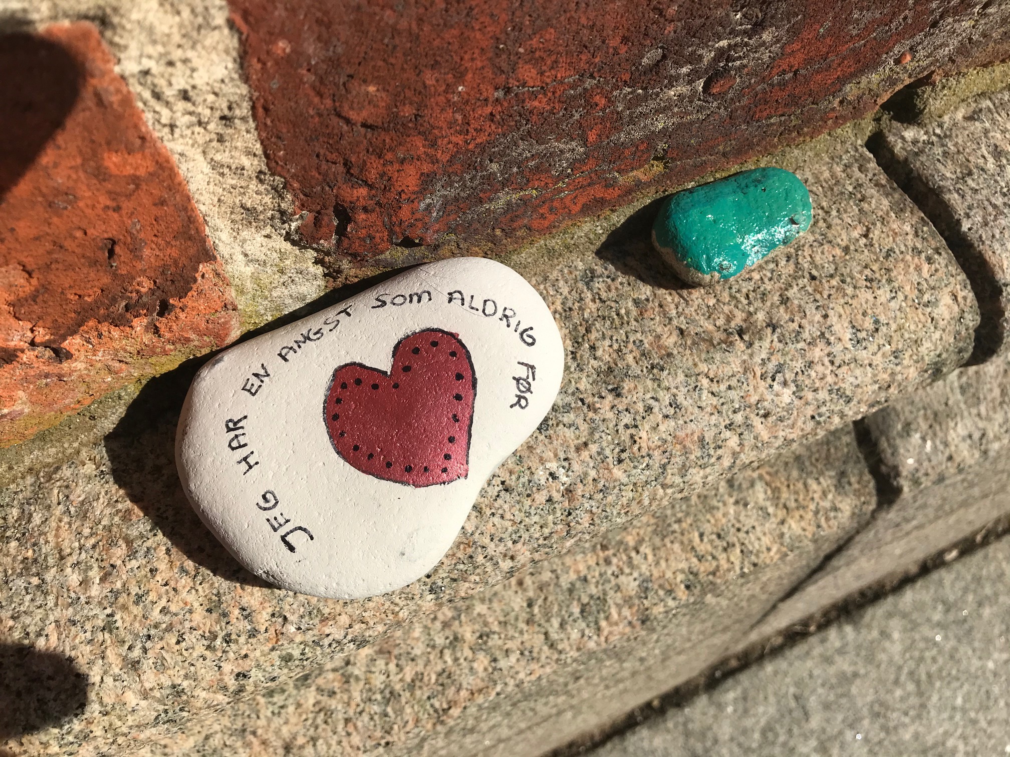 Ved domkirken fandt jeg disse to sten. Den grønne sten håber jeg symboliserer håb, den anden bekymrer mig mere, en person har det skidt. Mange lider under det Corona nedlukkede liv, selv om vi er på vej mod bedre tider. Måske hjælper det at skrive sig ud af det. Det håber jeg faktisk.