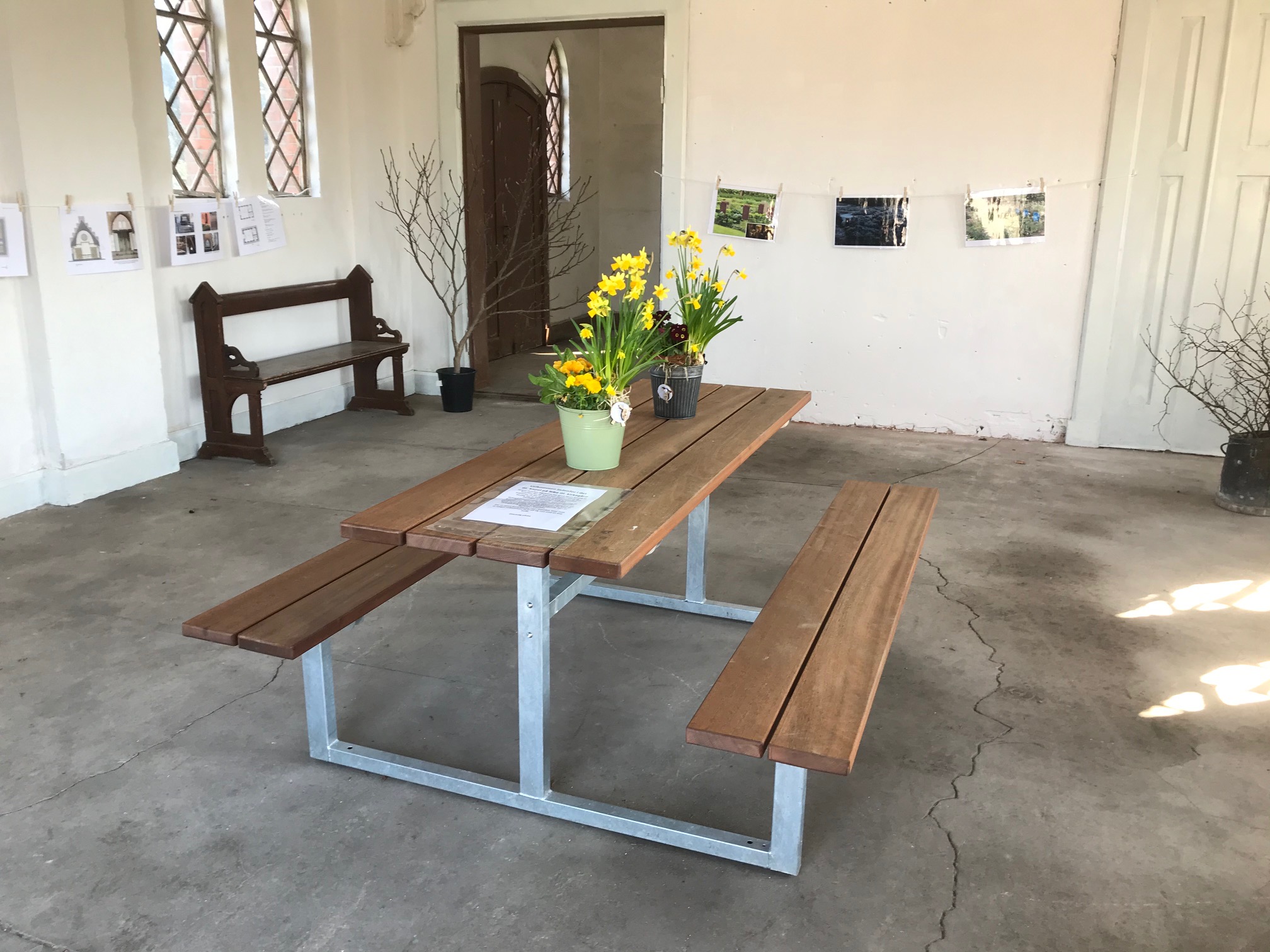 På den gamle kirkegård er der stadig mange aktiviteter og kirkegårdsmedarbejderne er gode til at sætte nye sammenplantninger ind i det gamle kapel, så det ser indbydende ud ved bordet.