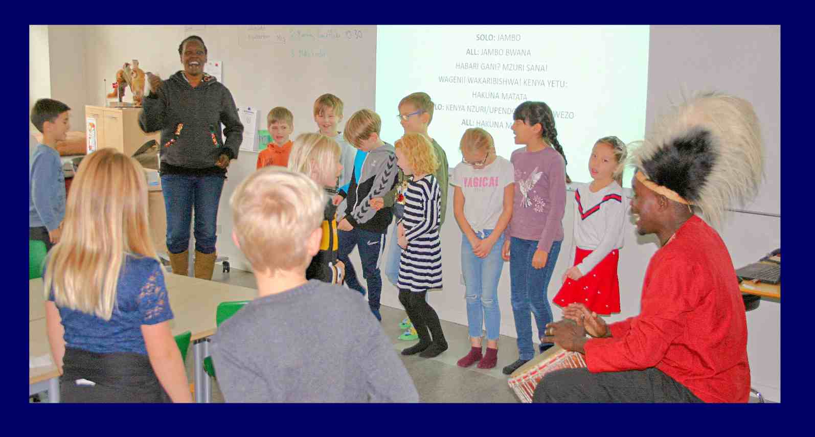 Der spilles på tromme og danses til Hakuna Matata på en folkeskole (Privat arkivfoto)