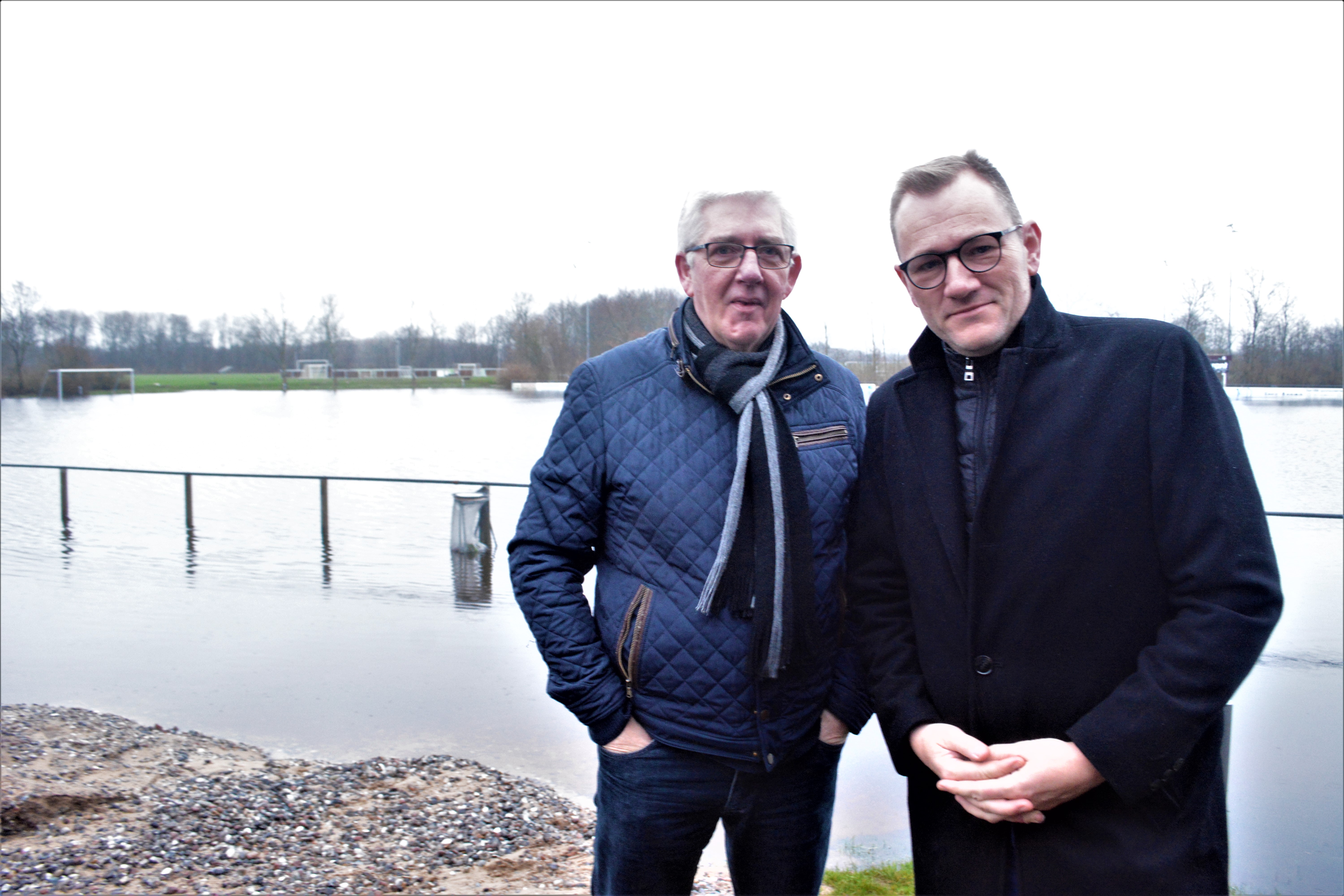 Ordene kommer fra folketingsmedlem Niels Flemming Hansen (C) og konstitueret byrådsmedlem Peder Tørnqvist (C) på kanten af det stadion i Ribe, der stadig er oversvømmet på trods af, at Beredskabsstyrelsen fredag pumpede omkring 5 millioner liter vand væk fra sportsbanerne.