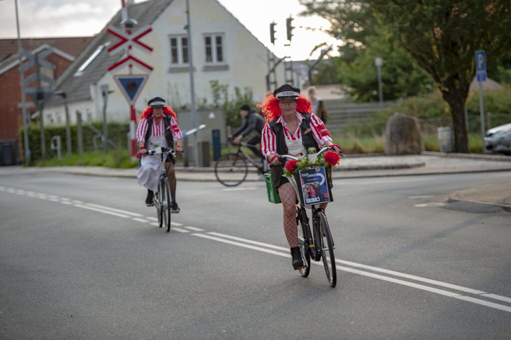Mange borgere havde taget opstilling ved hotellet så cykelløbet kunne følges på tætteste hold. I græsarealet var der opstillet borde/bænke og ud over en øl eller sodavand, var der gode grillpølser som var sponseret af Kvickly i Ribe. Rigtig mange lokale firmaer støttede det gode initiativ. Nogle sponsorer gav et fast beløb, andre et beløb for hver runde der blev cyklet. Inden løbet blev sat i gang annoncerede speakeren, at færdselsloven skulle overholdes og man skulle se sig for. At blive set var nok ikke så svært. Se blot de to skønne kvinder med de røde parykker, Marietta og Hanne fra hotellet, de lyste da op i løbet. Et dejligt lokalt sammenhold der samtidig gav gode penge til aktiviteter i byen.