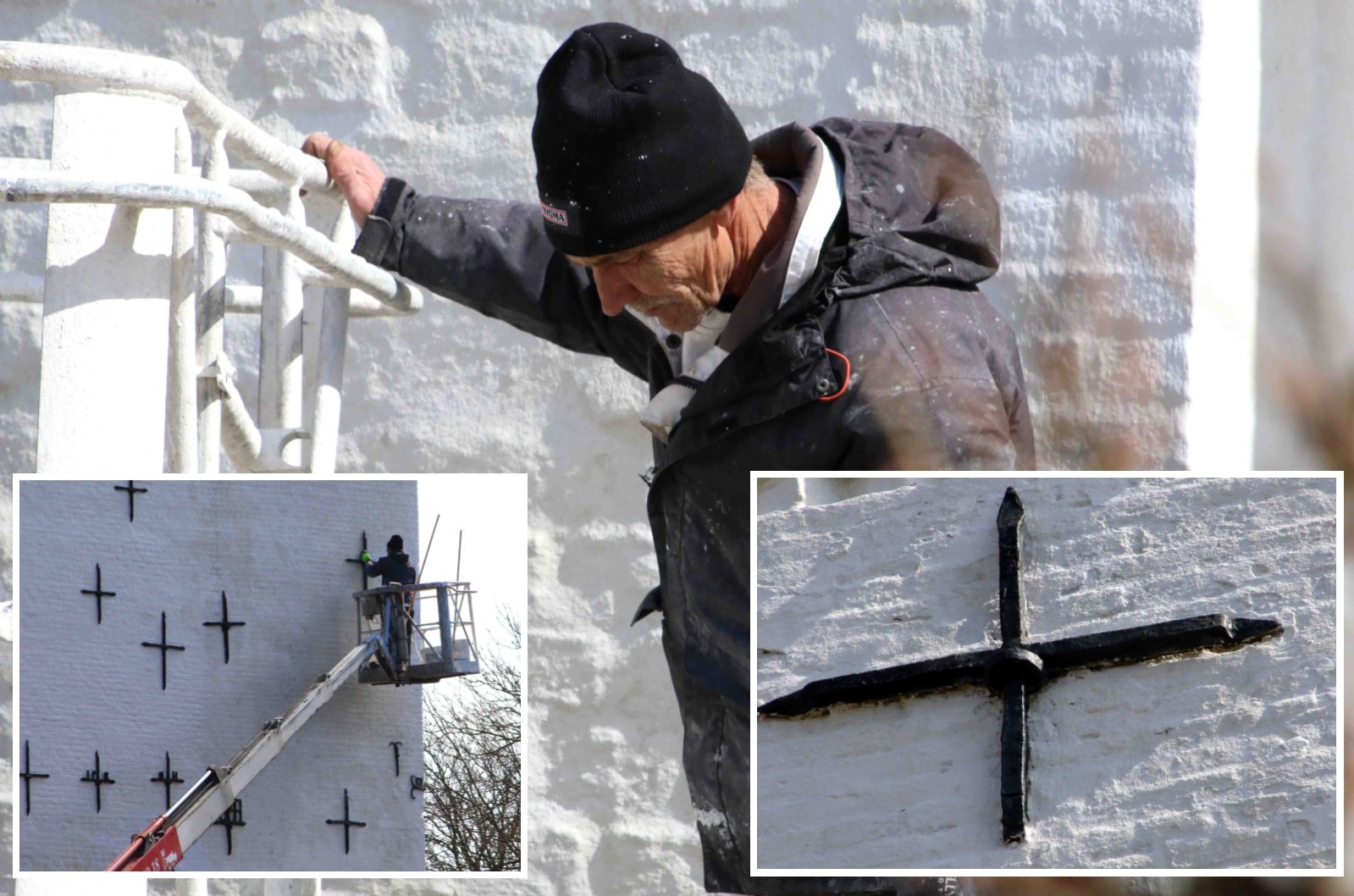 Leif nyder de store højder – arbejdet fra liften foregår hurtigt og sikkert. Det er blevet til 25 år for Dansk Kirkekalk.