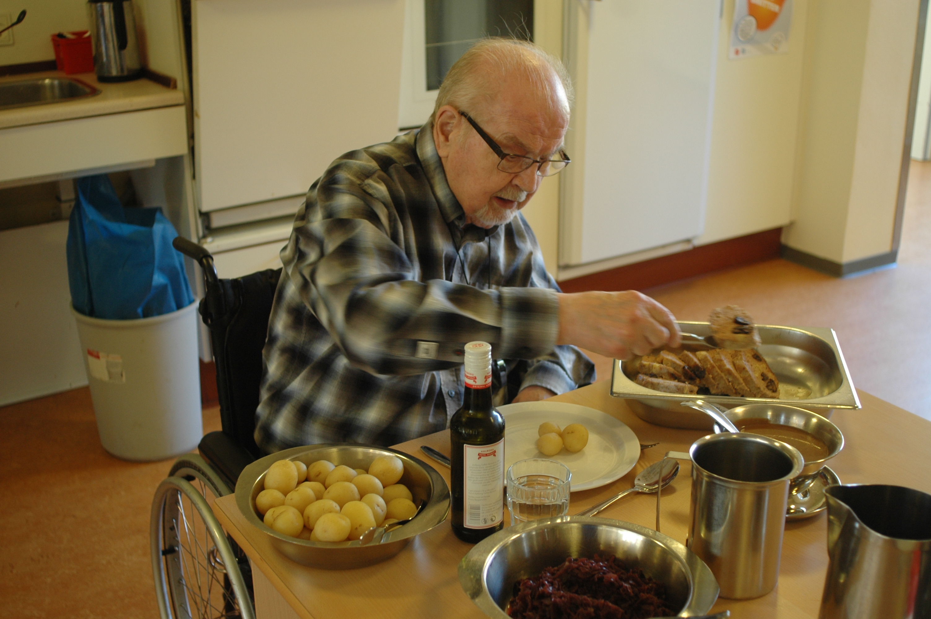 Aalborg Akvavit, Dansk Kartoffelråd og Flensted stod bag både kartofler og snaps, og Bladkompagniet sørgede for udbringningen af de gode varer bl.a. til plejehjemmene Margrethegården, Åhaven og Dagmargården i Ribe. Og sådan blev Valdemarsdag fejret på plejehjemmene i en hyggelig stemning, hvor der var tid til de kvikke bemærkninger mellem beboere og personale.
