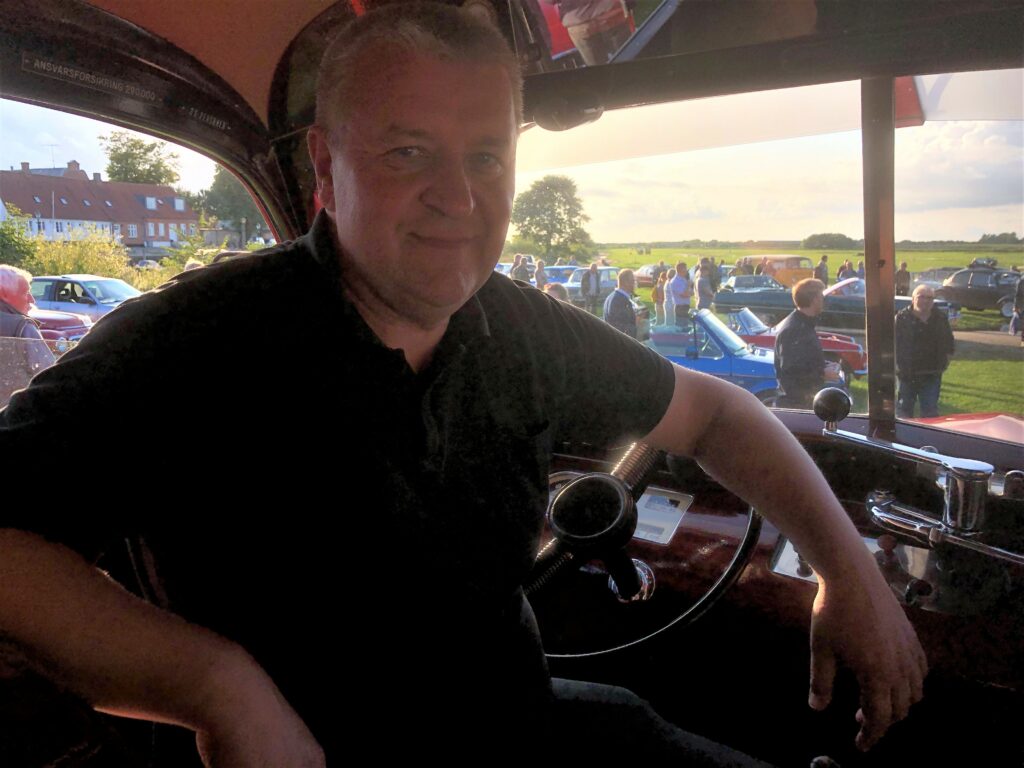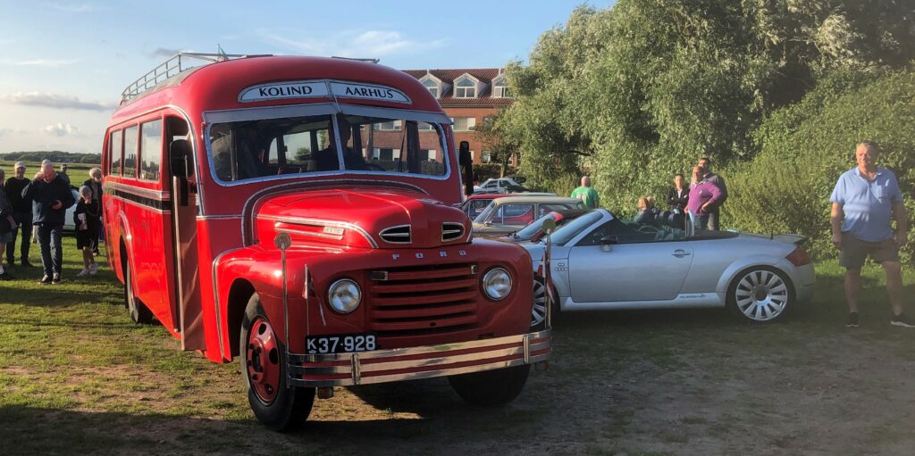Også Erik Schmidt fra Århus var til veteranbiltræf med sin rutebil, en Ford fra 1949, der gemmer en V8-motor under fronthjælmen. Det er en af de rigtig gamle ”rutebiler” og ikke busser, som kører på landevejene i dag. Karakteristisk har den et mekanisk greb, der åbner og lukker døren til bilen.