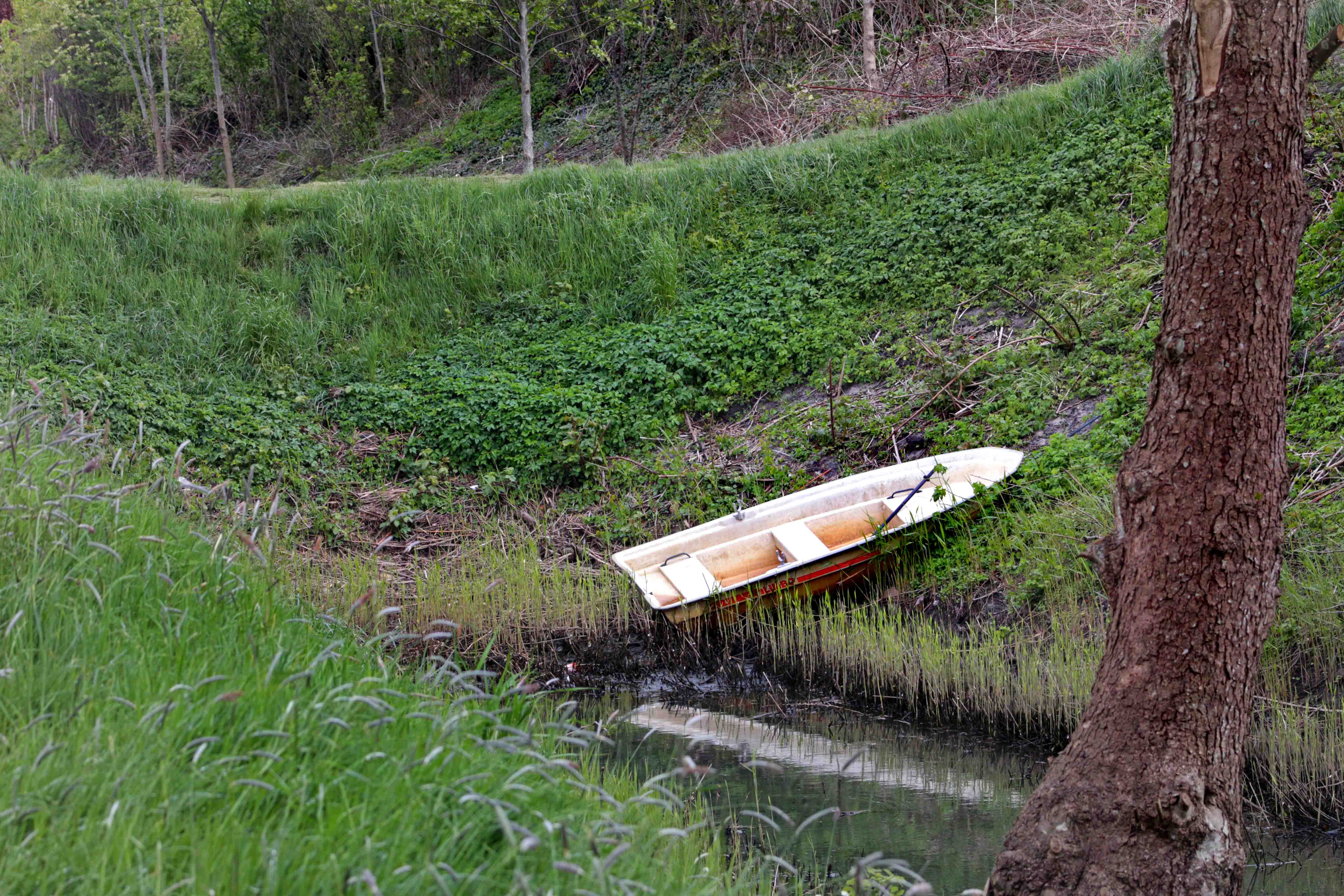 Af billedet med robåden på skrænten fremgår det ikke, om der er passage fra Stampemølleåen – ved en højere vandstand – ind til voldgraven.