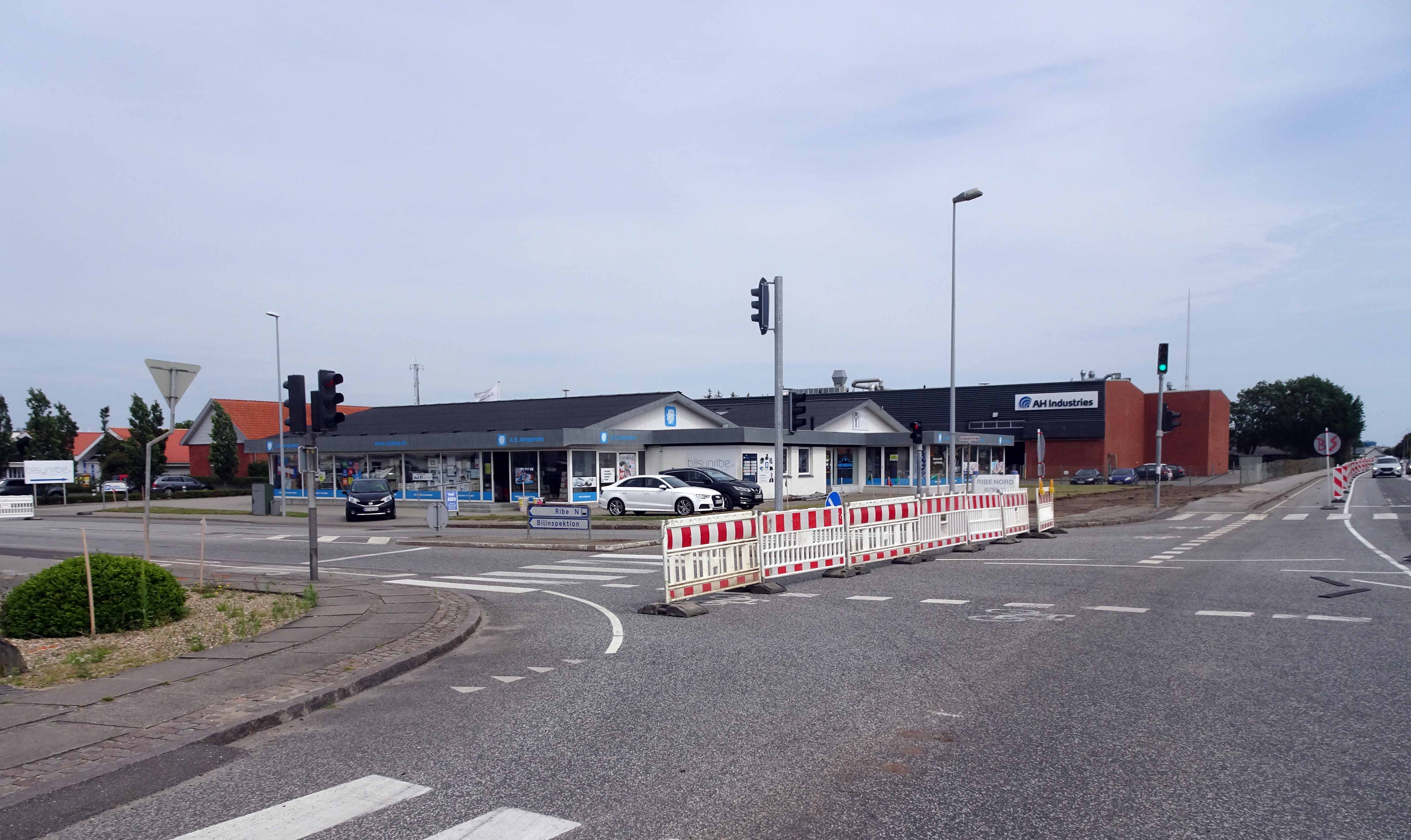 Det er dog muligt at passere Industrivej på cykel og som gående, men skal man til Villy Vejrup, Røde Kors og de øvrige butikker, må man tage rundkørslen ved den gamle Shell station.