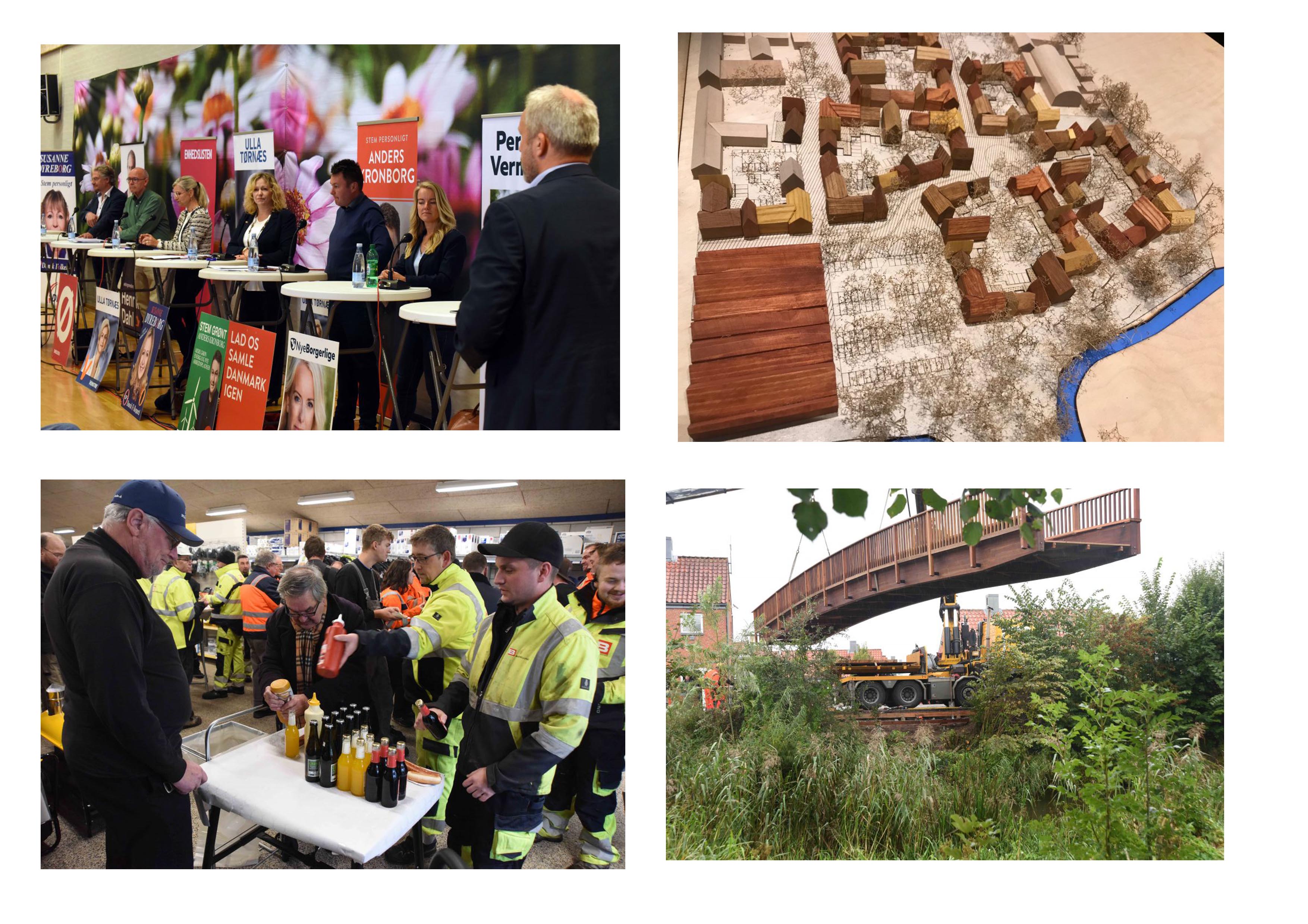 Det var valgår og Ribe Fritidscenter dannede rammen om et debatmøde arrangeret af den lokale Vestre forening. SB Butikken på Industrivej fejrede vejens åbning efter et halvt år med pølsevogn til kunderne og de som nu havde fået lyst til at kigge forbi. Et halvt år med faldende omsætning og et vejprojekt, der skabte en del irritation, er nok allerede glemt. Nye broer over Stampemølleåen. Den ene blev bygget på stedet: Liden Kirsten Bro – den anden blev kørt på et kæmpelad til Ribe. Den voldte problemer med at komme på plads. Et tilløbsstykke i fint vej, der sluttede med flere timers styrtende regn, men på plads kom broen. Bag dette projekt stod Ribe Byferie og Kirkegårdene i Ribe. Der er altså noget med Ribe og broer. Hvem husker i broen i Jedsted, der lige var kort nok, eller sommeren 2018 hvor Dagmarsbroen fik ny belægning. Så må man sige arbejdet på Ribe Jernindustris grund skrider fint frem i forsommeren står LIDL færdig – og så bliver det spændende at følge boligbyggeriet. En model af området har tidligere været vist i Støberiets lokaler.