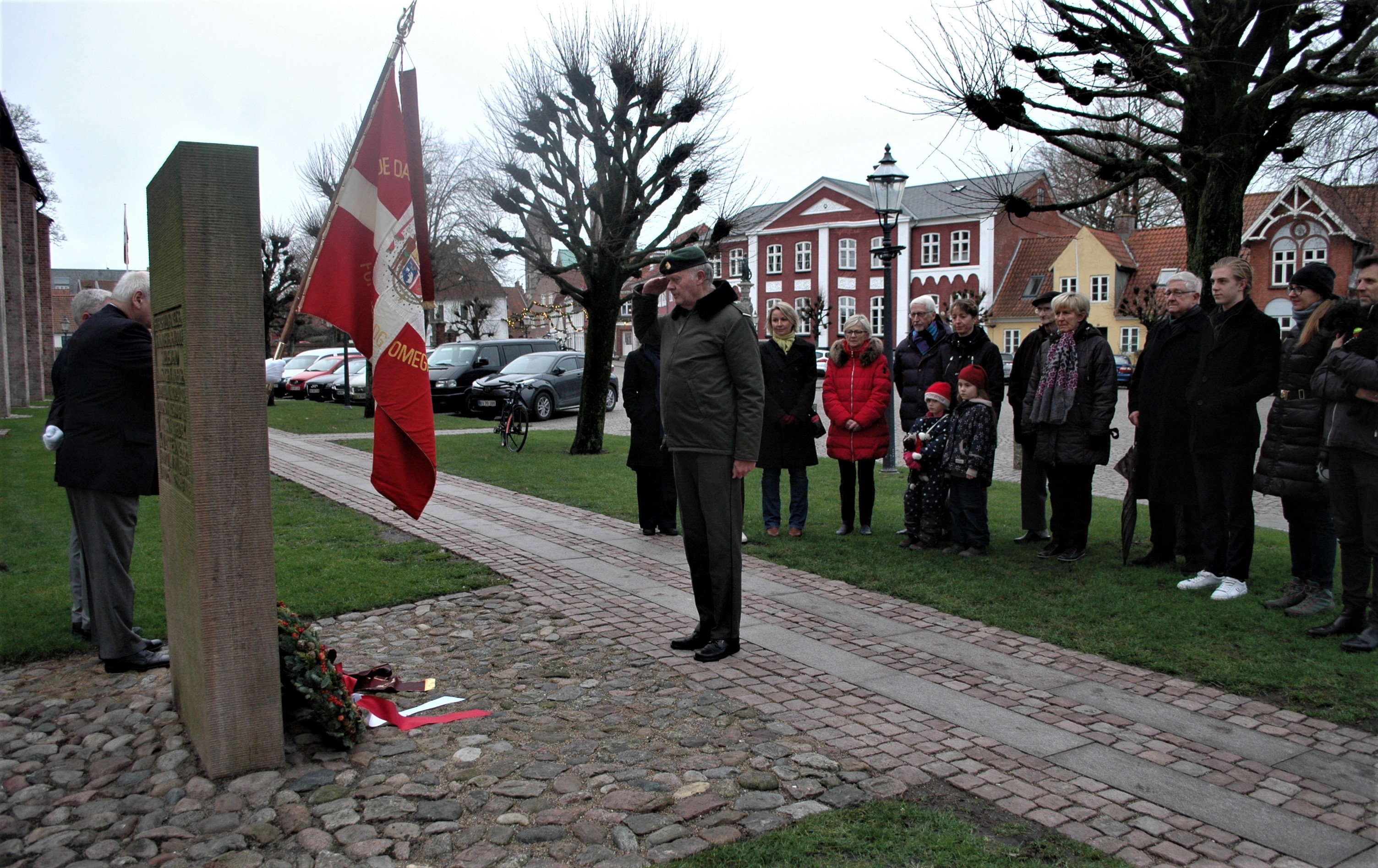 Foran mindestenen og forsvarsbrødrenes æresvagt og fane og med udsigt til den juleudsmykkede by gjorde Henrik Schroll honnør for de faldne.