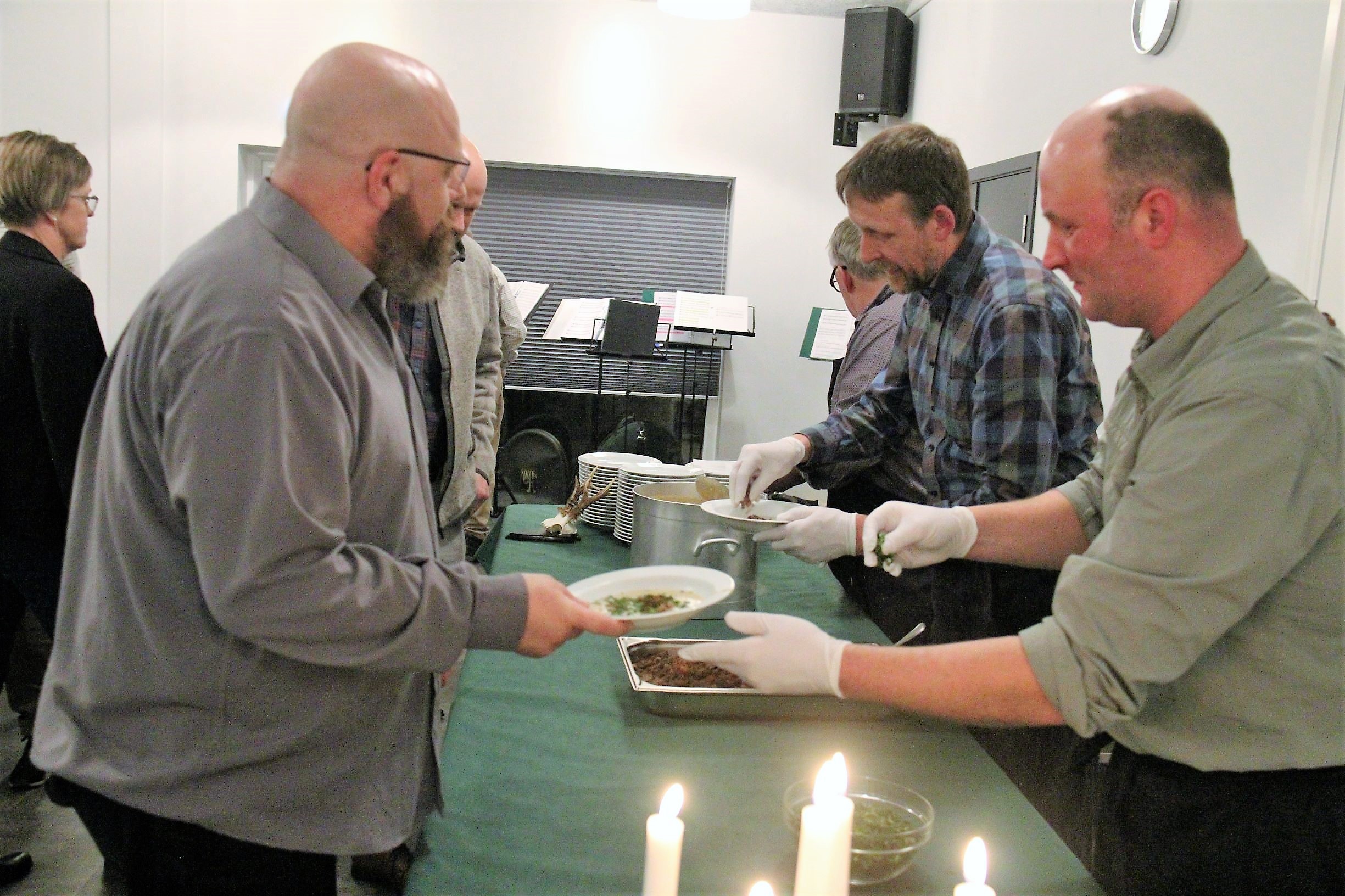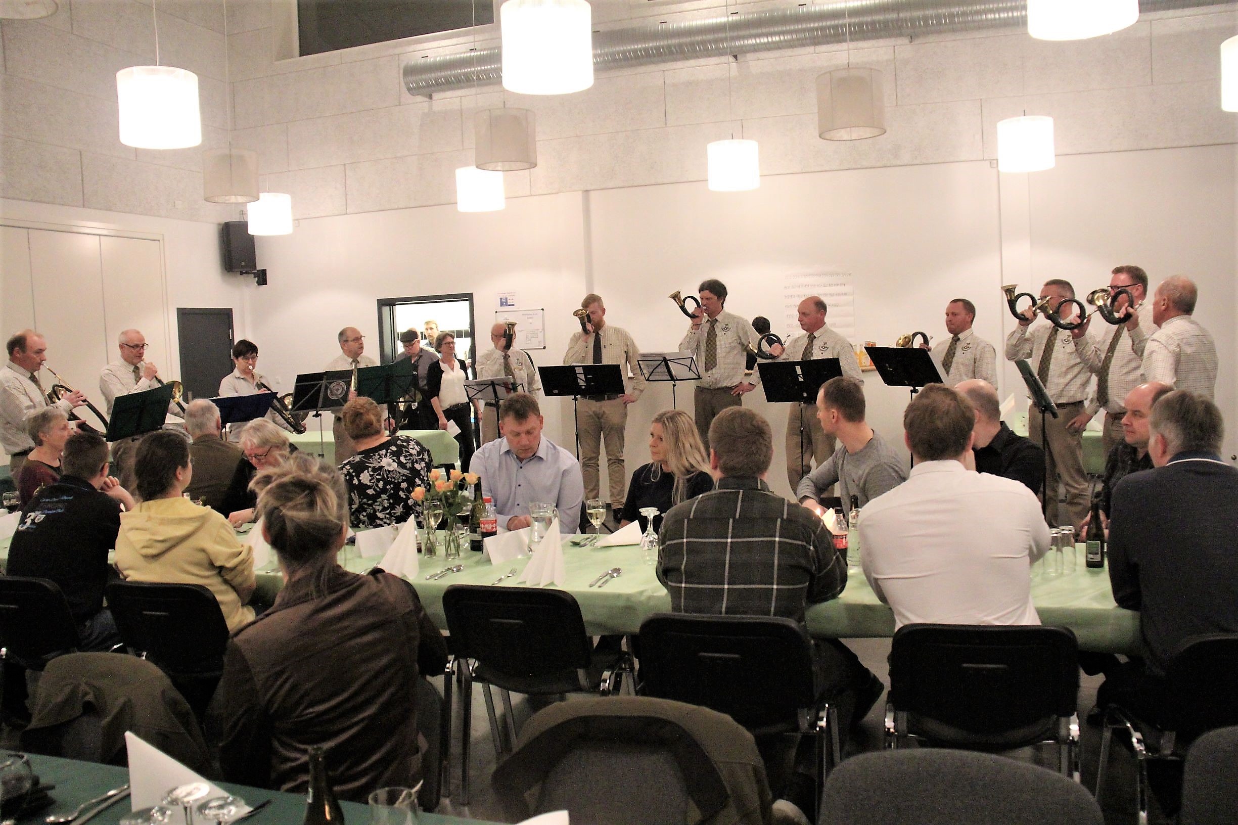 Det var overdådigt – som i et eventyr, da jægerne i Roager Medborgerhus leverede endnu en VILDT-aften for de godt 110 gæster, som i dagens anledning var klædt i festtøj. Og de mange smagsoplevelser løftede stemningen ved bordene – og det blev ikke mindre, da 12 hornblæserne fyldte lokalet med deres musik. ”Det lød bare fantastisk” – og måske tænkte en eller flere af gæsterne: ”Er det mon svært at spille på jagthorn?” Vadehavsblæserne siger hertil: ”Kan man fløjte en melodi, så kan man også lære at spille på jagthorn.”