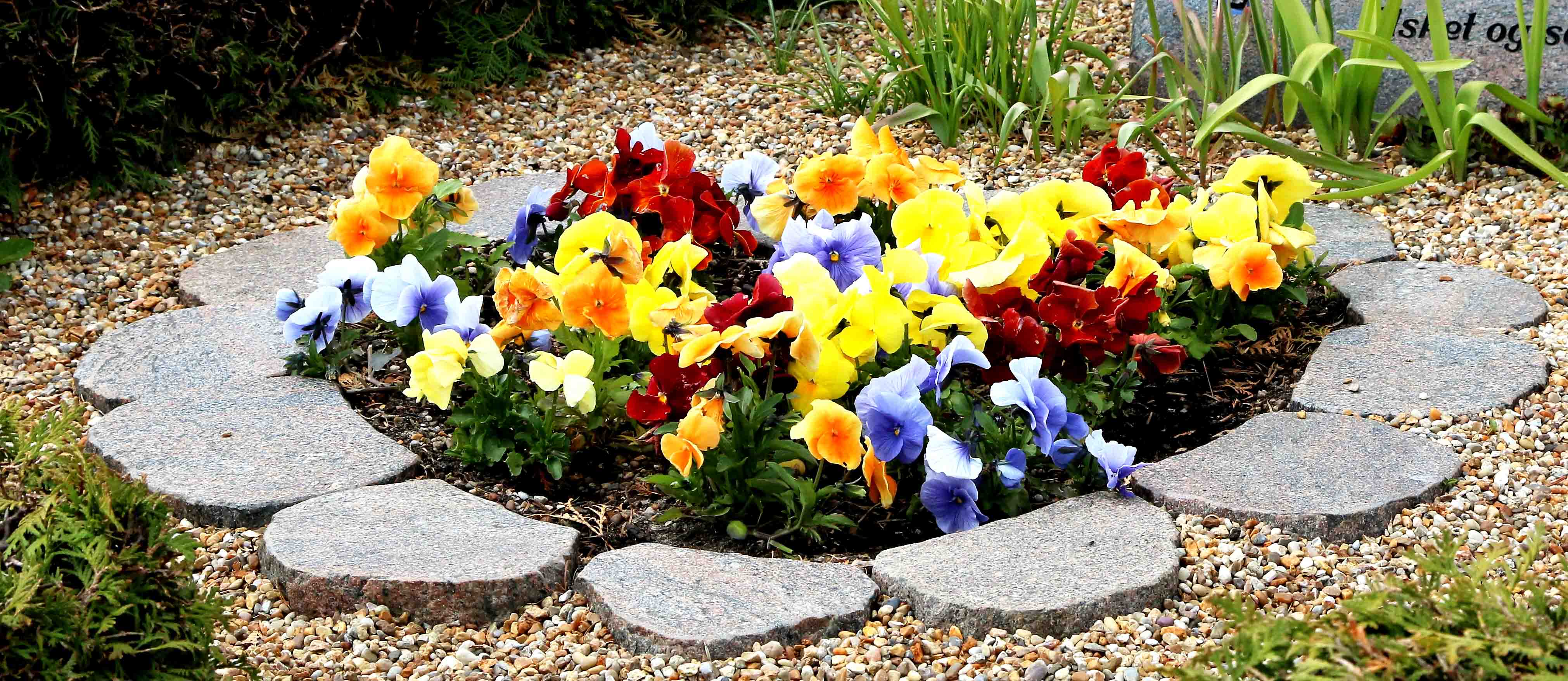 Og sådan er det også på kirkegården, hvor farverige stedmoderblomster lyser op på et gravsted. Det er tydeligt – blomsterne er passet – og har fået vand.