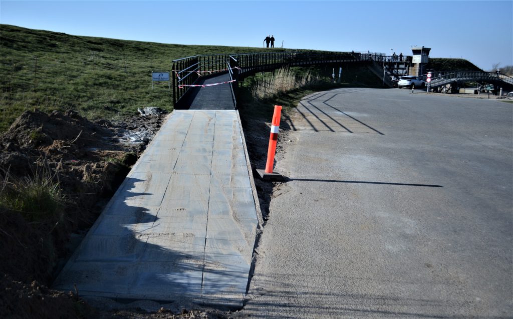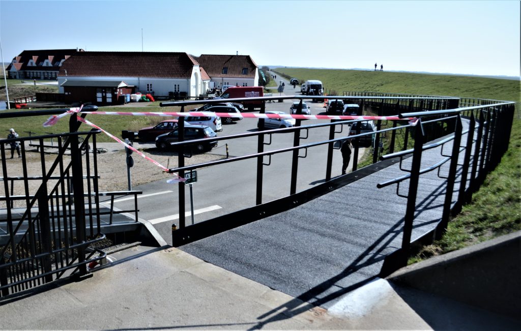 Første kørestolsbruger på rampen var Willy Lønne, Farup, der sammen med familie og venner var på besøg ved diget denne herlige sommerdag, og både venner og familie var begejstrede for den nye rampe. Willy Lønnes kørestol er forsynet med en elektrisk hjælpemotor, og han kom uden hjælp selv op på digekronen, og Bjarne Kiholm, der havde arrangeret turen, var også meget begejstret for rampen. Egentlig skulle rampen officielt have været taget i brug den 6. april, men som så meget andet satte en berømt virus en kæp i hjulet.